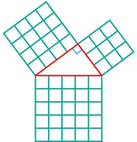 讲解:商高所指的面积关系可以用图形表示.如图,红色直角三角形的三边长分别为3,4,5,分别以这三边为边向外作正方形,所得正方形的面积分别为9,16,25,且9+16=25.从边的角度看,这个直角三角形的三边满足:两条直角边长的平方和等于斜边长的平方.