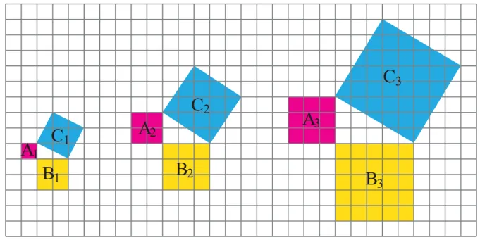 追问:其他直角三角形的三边是否也满足上述数量关系? 探究:如图,每个小方格的面积均为1,图中正方形A1,B1,C1的面积之间有什么关系?A2,B2,C2呢?A3,B3,C3呢? 以格点为顶点,在方格纸中任意画一个直角三角形,类似地作出三个正方形,这三个正方形的面积有什么关系?由此,你能得出关于直角三角形三边关系的猜想吗?