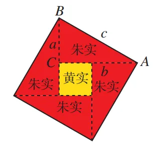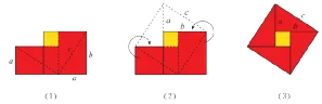 赵爽指出:按弦图,又可以勾股相乘为朱实二,倍之为朱实四.以勾股之差自相乘为中黄实.加差实,亦成弦实. 赵爽利用弦图证明这个猜想的基本思路如下:如图(1)所示,把边长分别为a,b的两个正方形连在一起,它的面积是a2+b2 .这两个正方形还可以分割成四个全等的直角三角形(红色)和一个正方形(黄色),把图(1)中左、右两个三角形移到图(2)中所示的位置,就会形成一个以c为边长的正方形(图 (3)),它的面积是c2 .因为图(1)与图(3)都由四个全等的直角三角形(红色)和一个正方形(黄色)组成,所以它们的面积相等,即a2+b2=c2 .