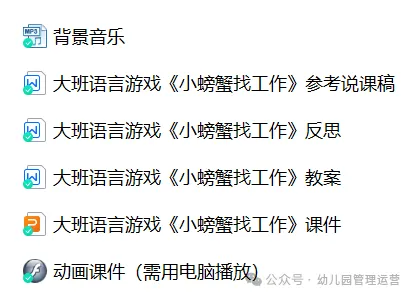 我用夸克网盘分享了「084大班语言游戏《小螃蟹找工作》视频+教案+课件」,点击链接即可保存。打开「夸克APP」,无需下载在线播放视频,畅享原画5倍速,支持电视投屏。