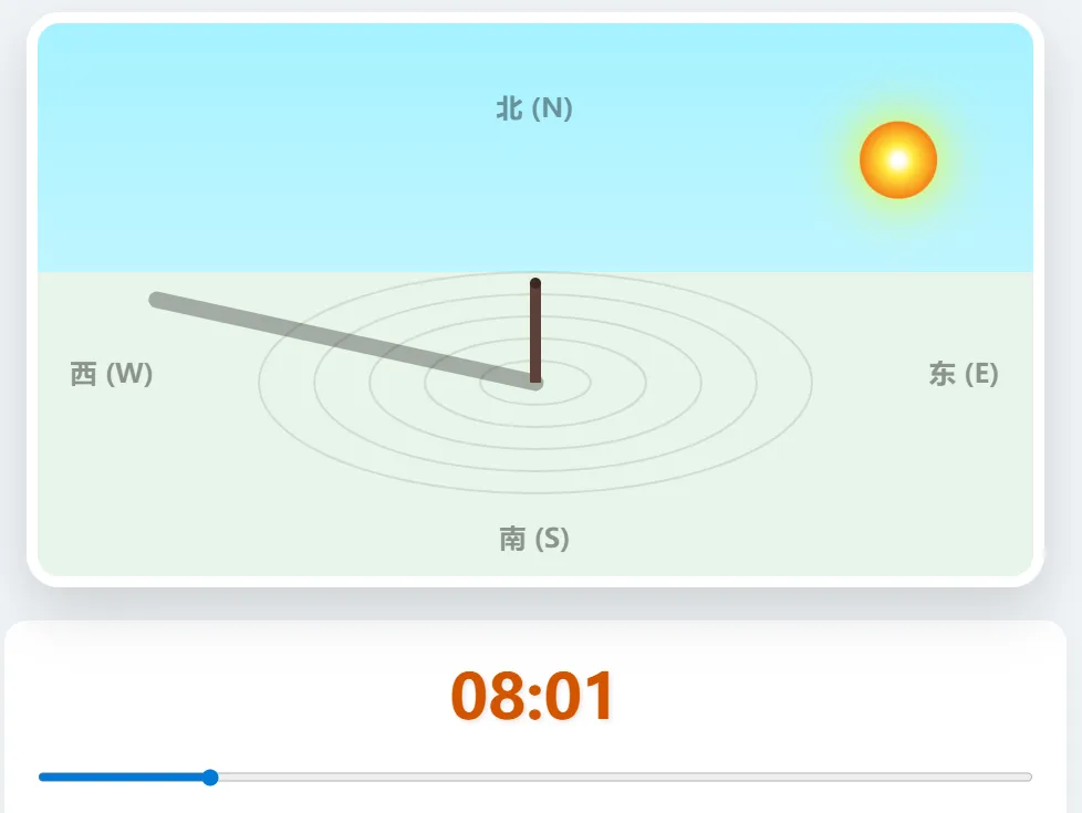 让他生成一个HTML,然后生动可视化地讲解这节课的知识,我需要显示时间,比如早上几点到下午几点实时显示时间,我的手指拖动一个滑杆就可以拖动太阳的位置,然后影子也会动态的变化,时间也会动态的变化,要符合北半球中纬度的规律,也就是太阳是东升西落,而且太阳是从东南方向走出来的,在南半边的天空,影子是往北边去变化的,而且影子是从早上慢慢从长变成短到中午最短,从中午到下午又慢慢地变长。