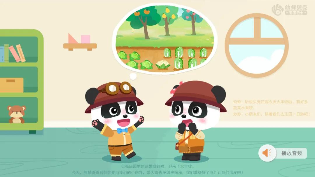 ——贝壳庄园里的蔬果成熟啦,迎来了大丰收。今天,熊猫奇奇和妙妙要当我们的小向导,带大家去庄园里探秘,你们准备好了吗?让我们出发吧!