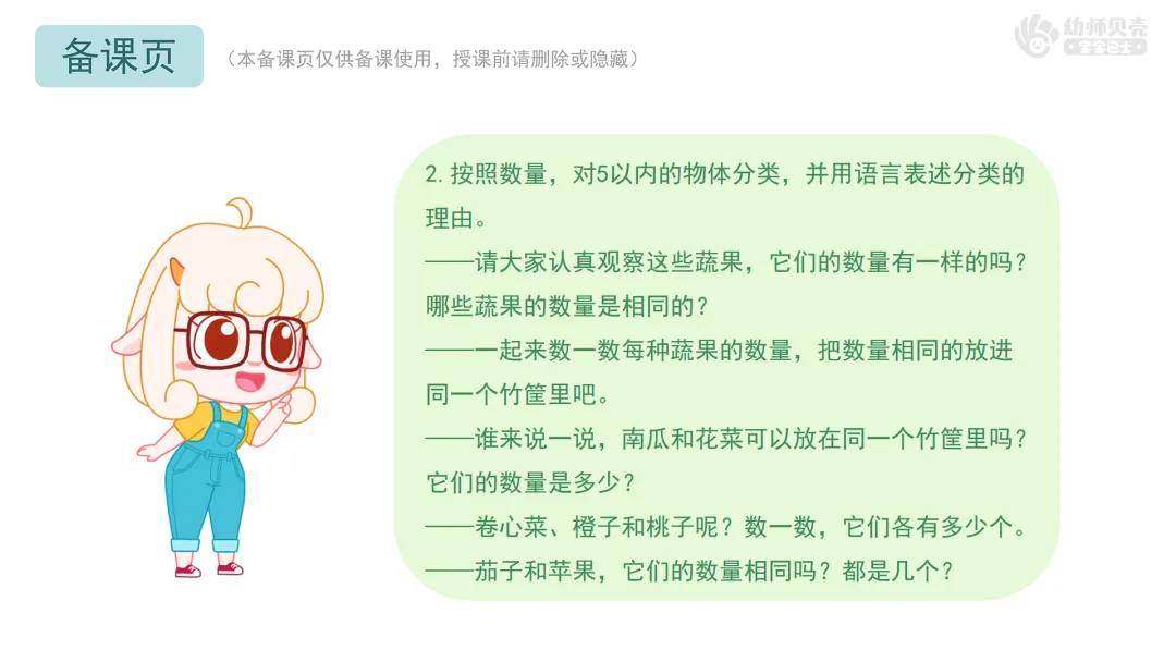 Ø活动建议:在幼儿在用语言讲述分类理由时,教师可引导幼儿用“都是XX”“一样多”等词语进行阐述。