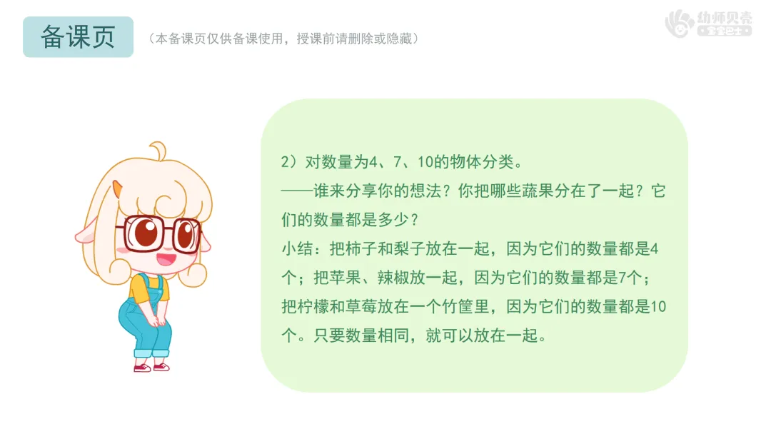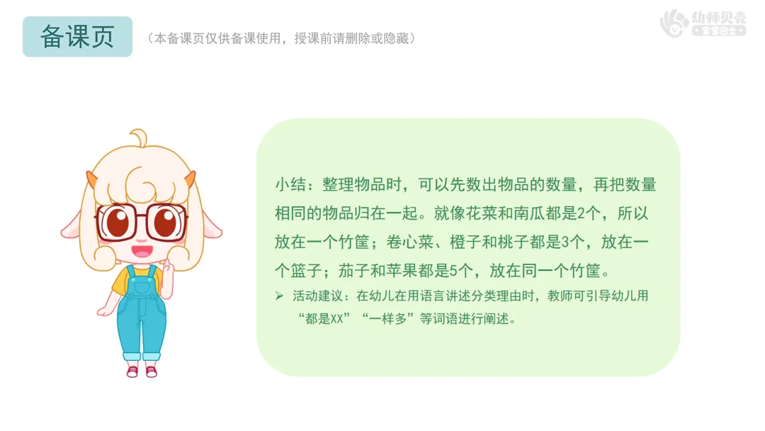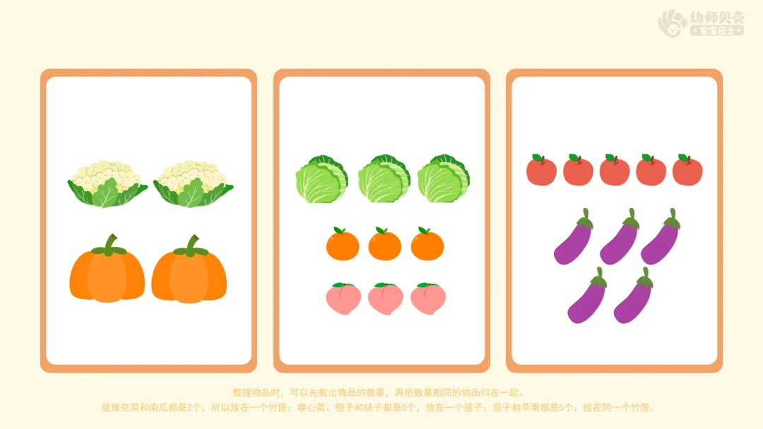 小结:整理物品时,可以先数出物品的数量,再把数量相同的物品归在一起。就像花菜和南瓜都是2个,所以放在一个竹筐;卷心菜、橙子和桃子都是3个,放在一个篮子;茄子和苹果都是5个,放在同一个竹筐。