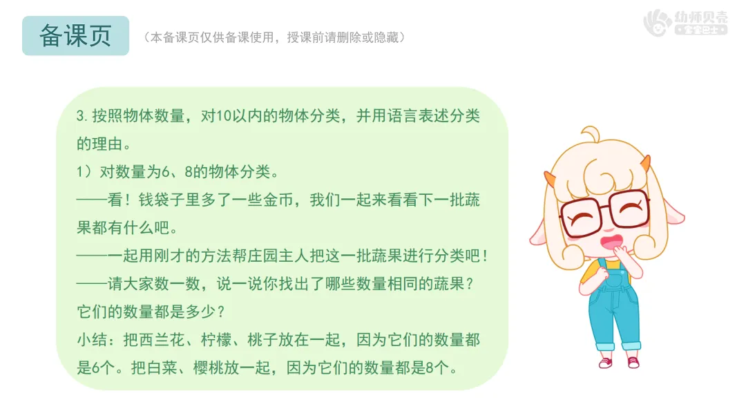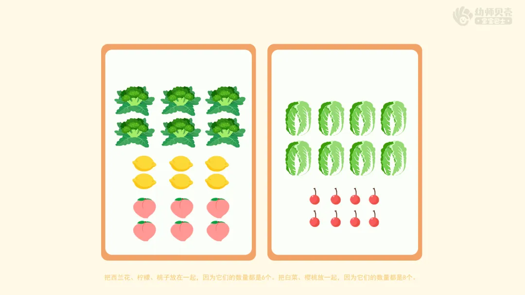 小结:把西兰花、柠檬、桃子放在一起,因为它们的数量都是6个。把白菜、樱桃放一起,因为它们的数量都是8个。