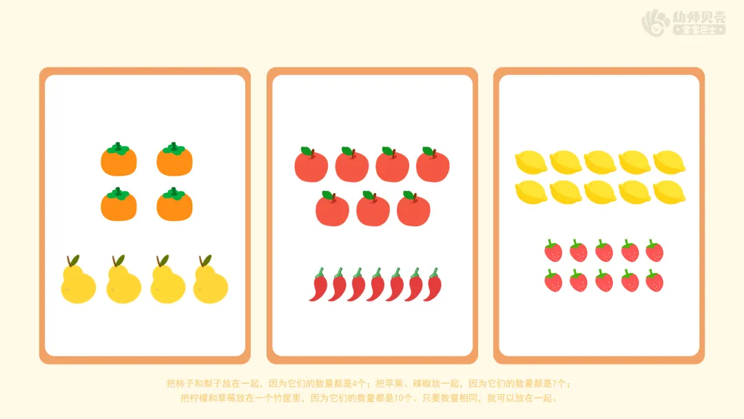 小结:把柿子和香蕉放在一起,因为它们的数量都是4个;把苹果、小黄瓜放一起,因为它们的数量都是7个;把枣子和草莓放在一个竹筐里,因为它们的数量都是10个。只要数量相同,就可以放在一起。
