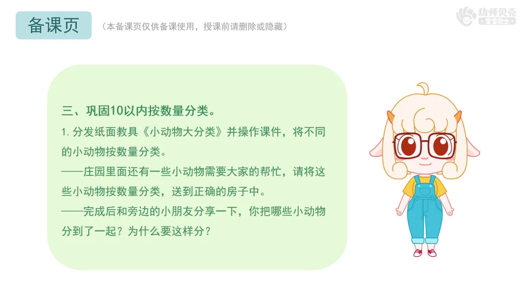 ——完成后和旁边的小朋友分享一下,你把哪些小动物分到了一起?为什么要这样分?