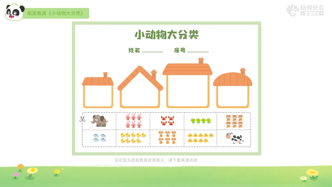 1.分发纸面教具《小动物大分类》并操作课件,将不同的小动物按数量分类。