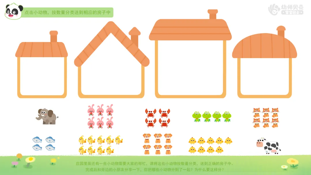 ——庄园里面还有一些小动物需要大家的帮忙,请将这些小动物按数量分类,送到正确的房子中。