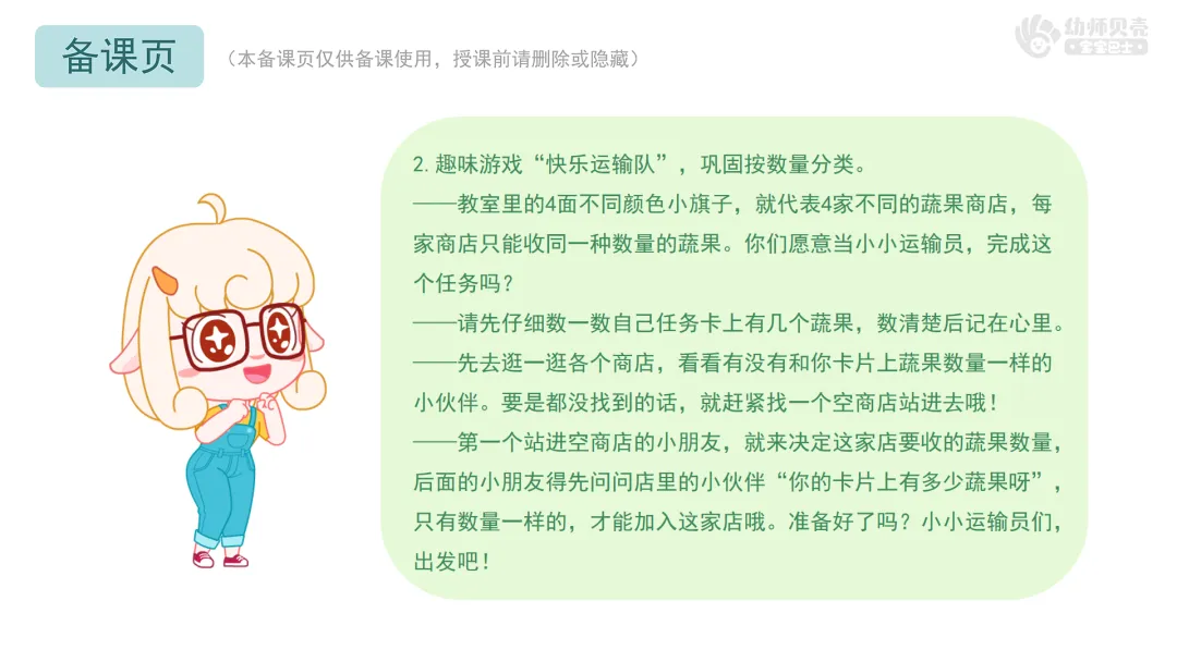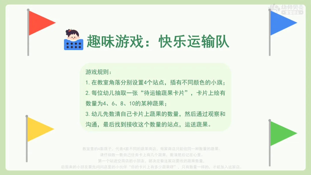 ——第一个走到空商店的小朋友就站在那里,这家商店就固定收这个数量的蔬果了,后面的小朋友要先问问站在店里的小朋友卡片上的蔬果数量是多少,和自己数量一样的才能站到这家店哦。准备好了吗?小小运输员们,出发吧!