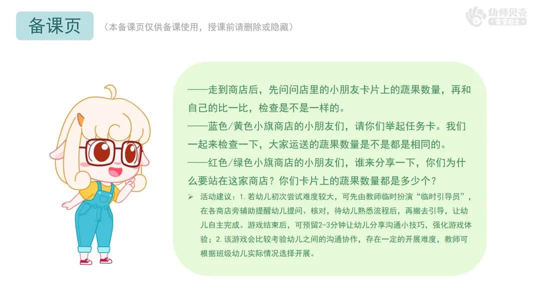 ——走到商店后,先问问店里的小朋友卡片上的蔬果数量,再和自己的比一比,检查是不是一样的。