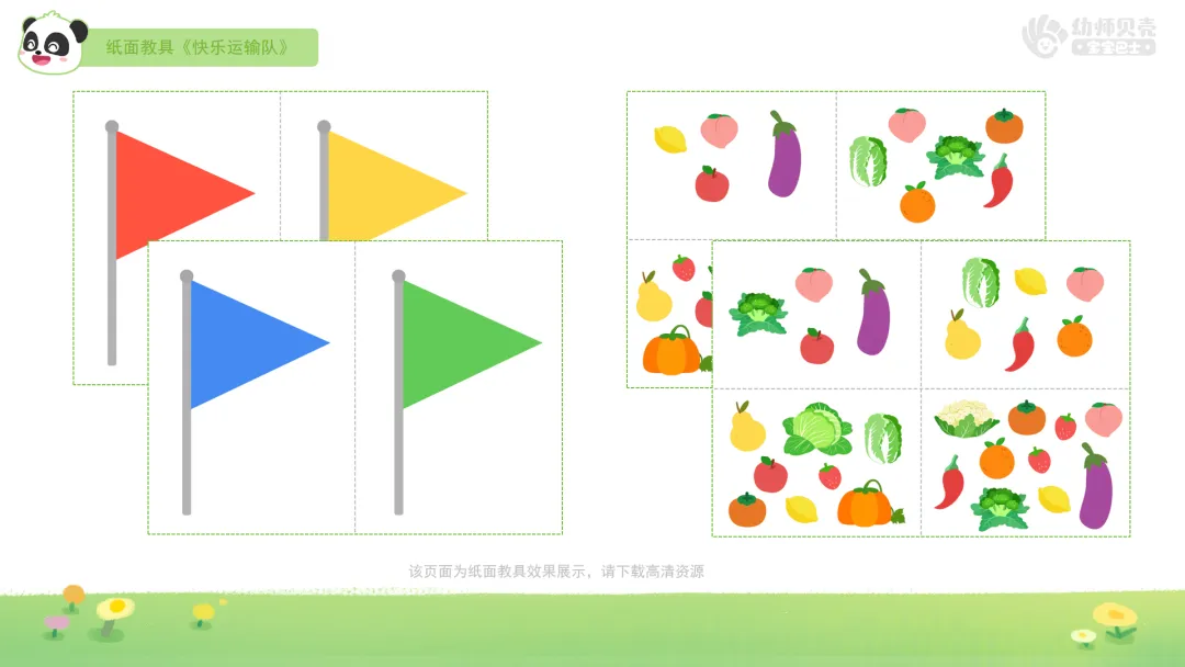 ——蓝色/黄色小旗商店的小朋友们,请你们举起任务卡。我们一起来检查一下,大家运送的蔬果数量是不是都是相同的。