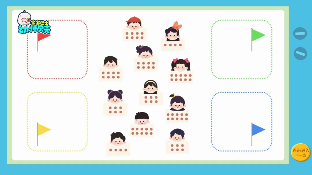 ——教室里的4面不同颜色小旗子,就代表4家不同的蔬果商店,每家商店只能收同一种数量的蔬果。你们愿意当小小运输员,完成这个任务吗?