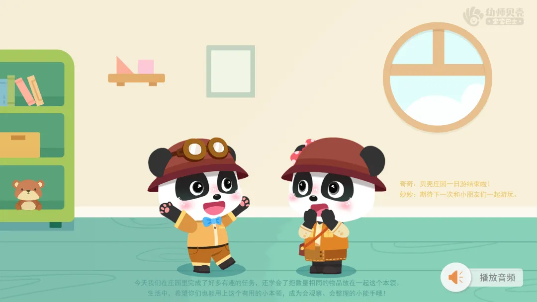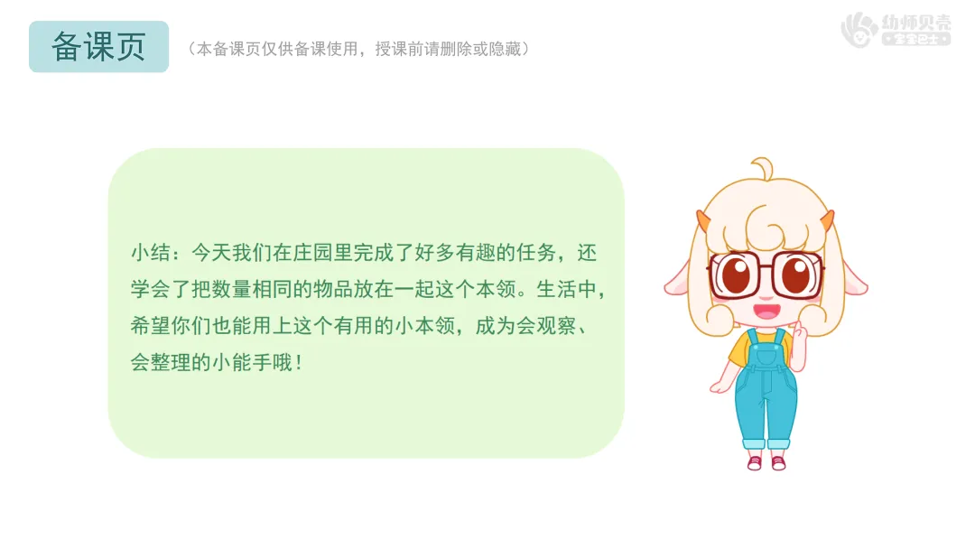小结:今天我们在庄园里完成了好多有趣的任务,还学会了把数量相同的物品放在一起这个本领。生活中,希望你们也能用上这个有用的小本领,成为会观察、会整理的小能手哦!