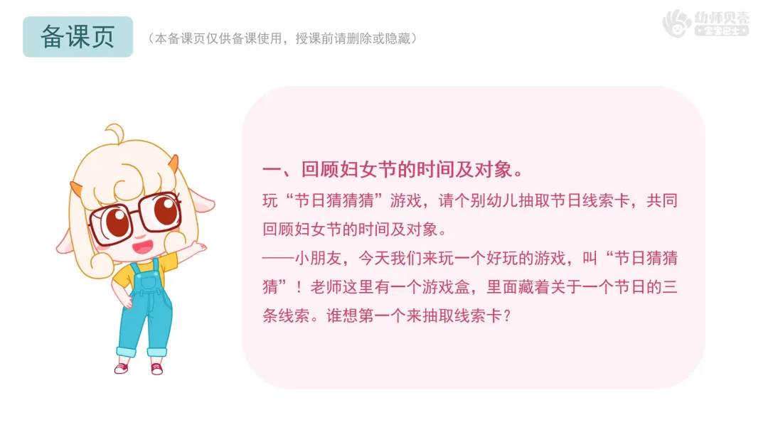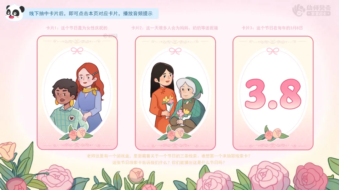 玩“节日猜猜猜”游戏,请个别幼儿抽取节日线索卡,共同回顾妇女节的时间及对象。