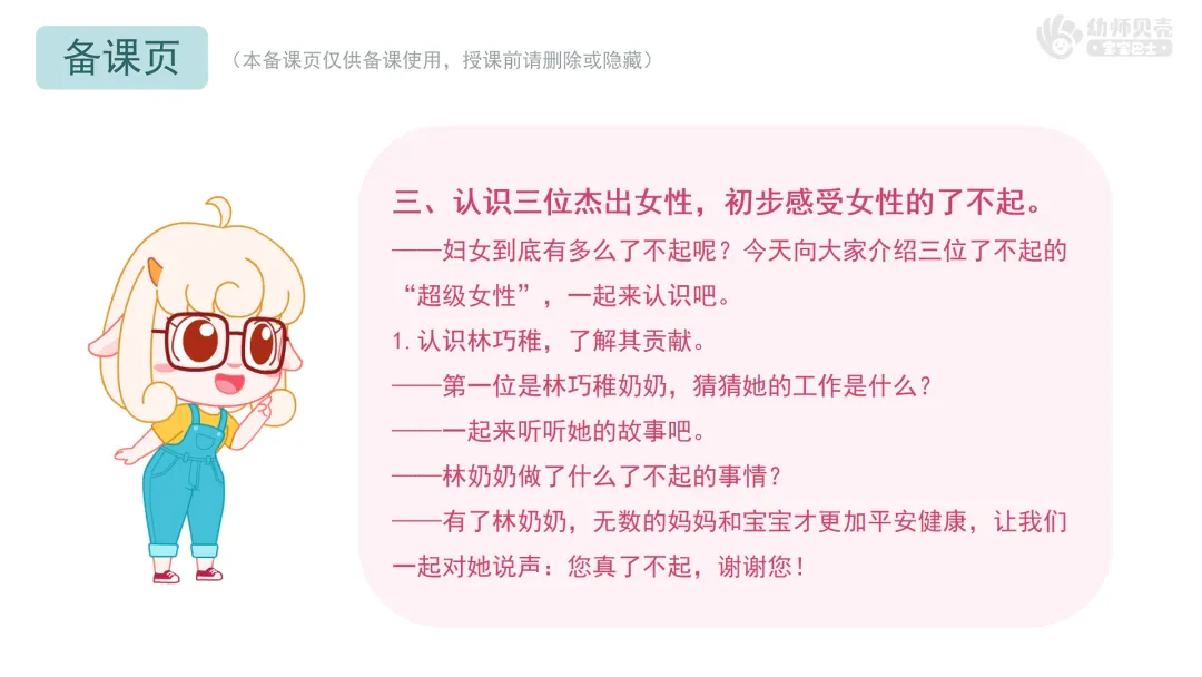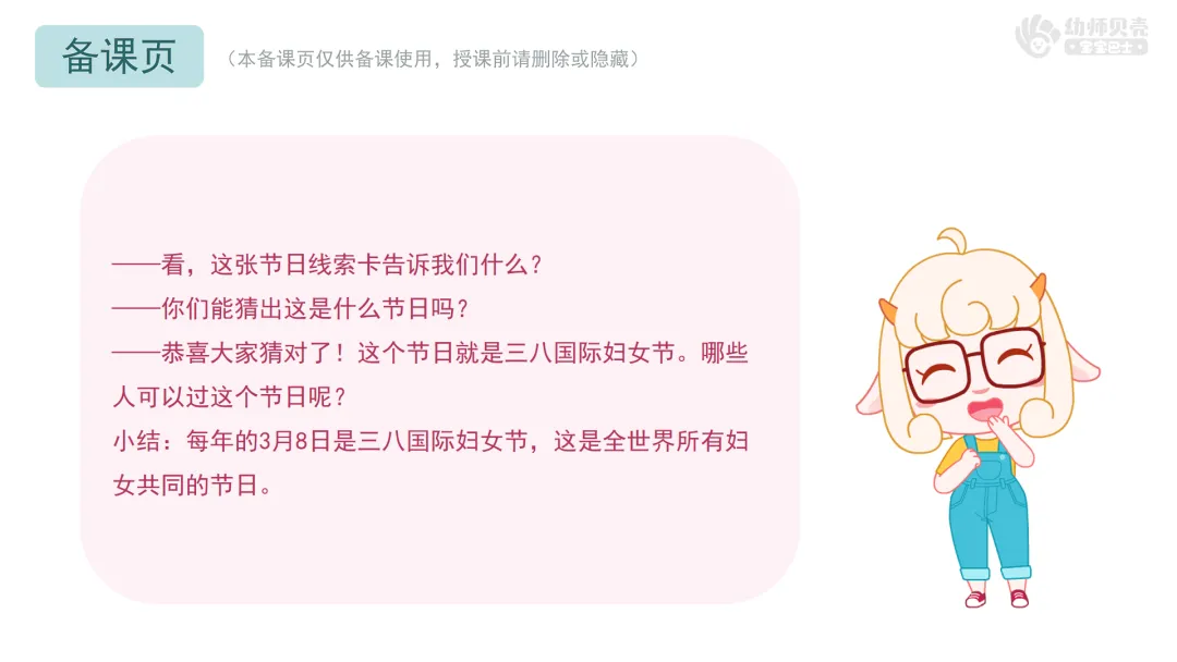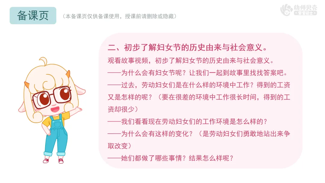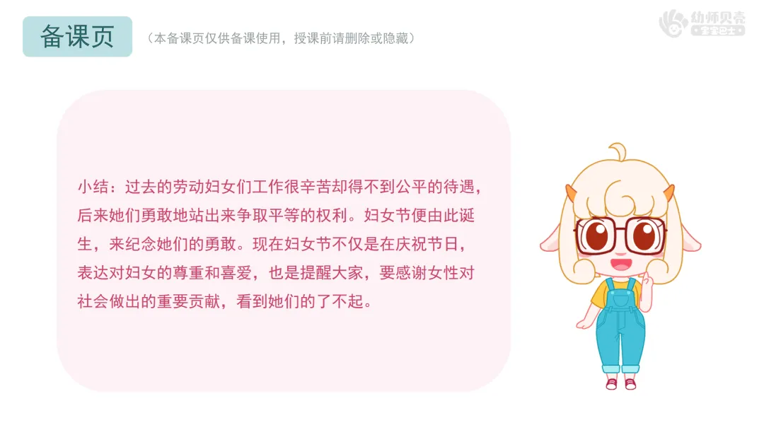 l重点:初步了解妇女节的历史由来,表达对女性的感谢与敬佩之情。