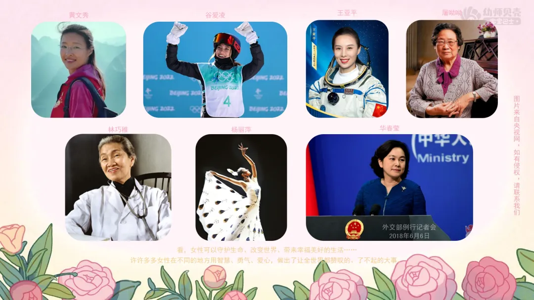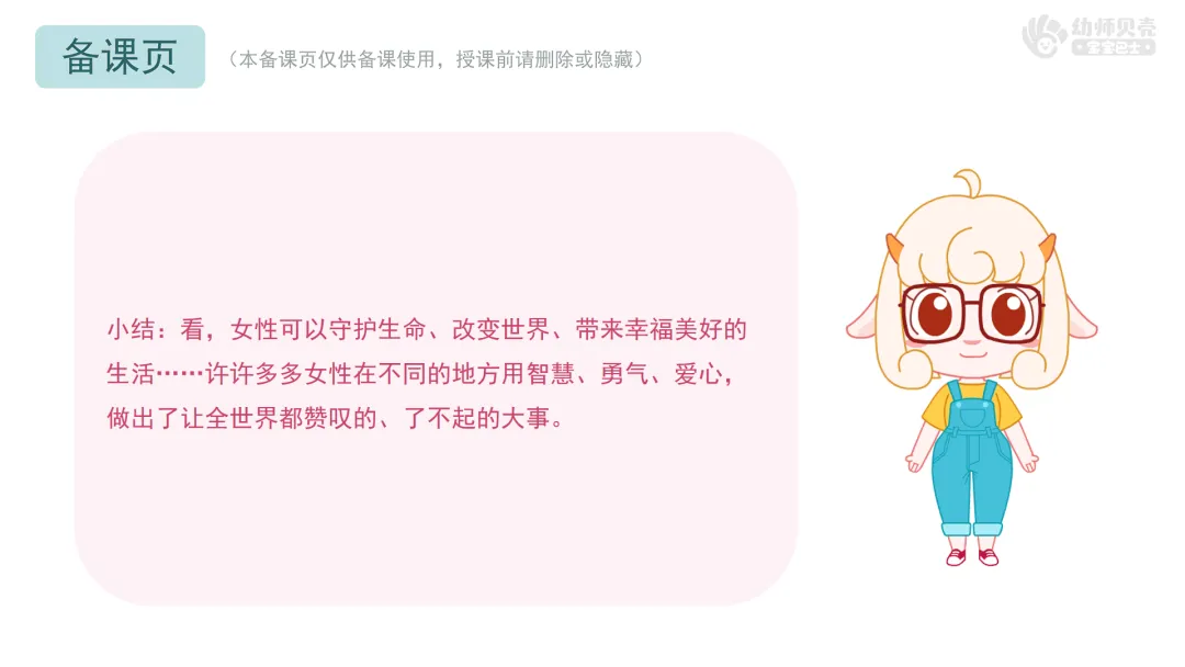 小结:看,女性可以守护生命、改变世界、带来幸福美好的生活……许许多多女性在不同的地方用智慧、勇气、爱心,做出了让全世界都赞叹的、了不起的大事。