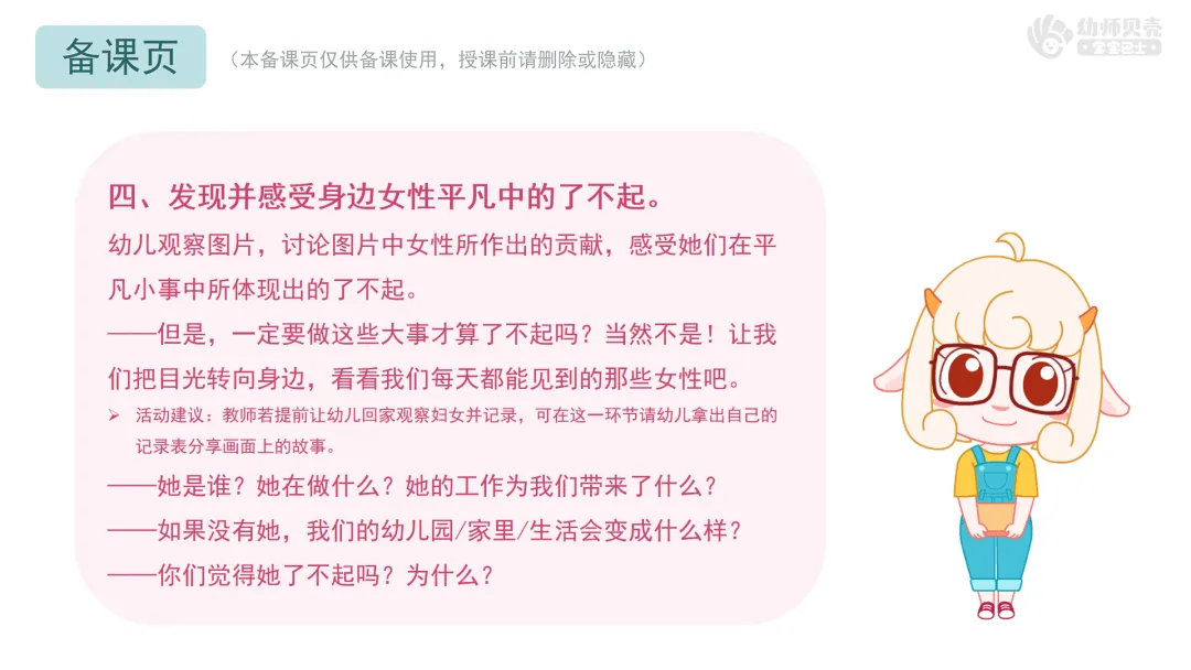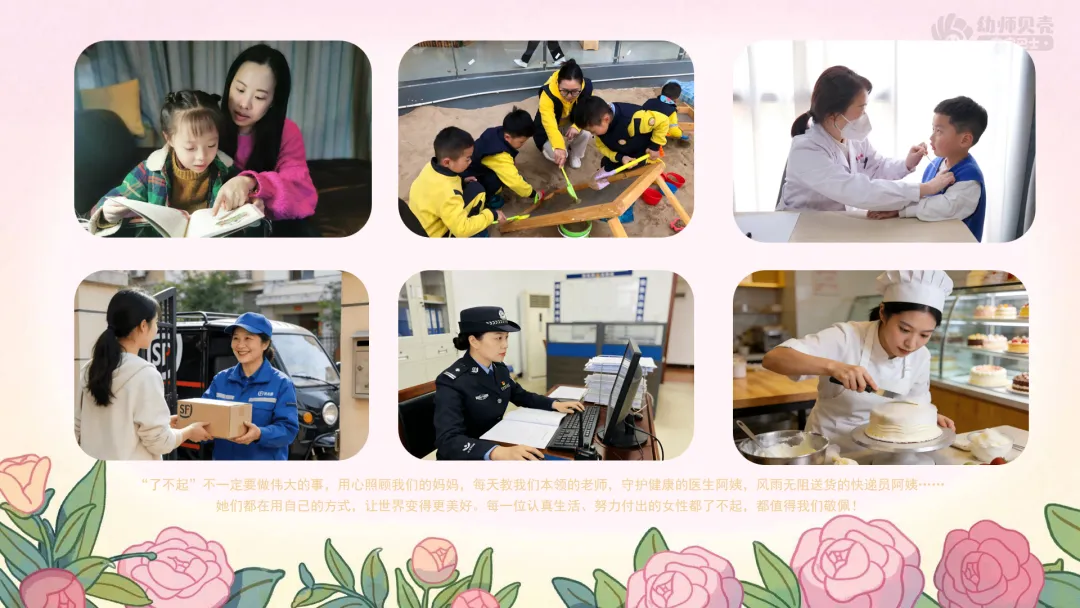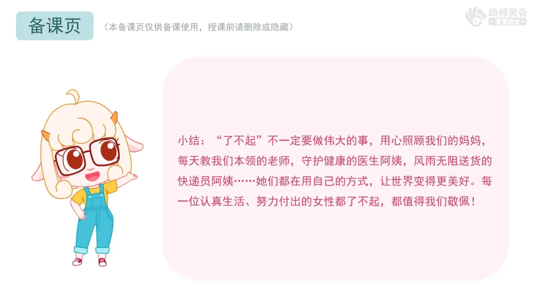 小结:“了不起”不一定要做伟大的事,用心照顾我们的妈妈,每天教我们本领的老师,守护健康的医生阿姨,风雨无阻送货的快递员阿姨……她们都在用自己的方式,让世界变得更美好。每一位认真生活、努力付出的女性都了不起,都值得我们敬佩!