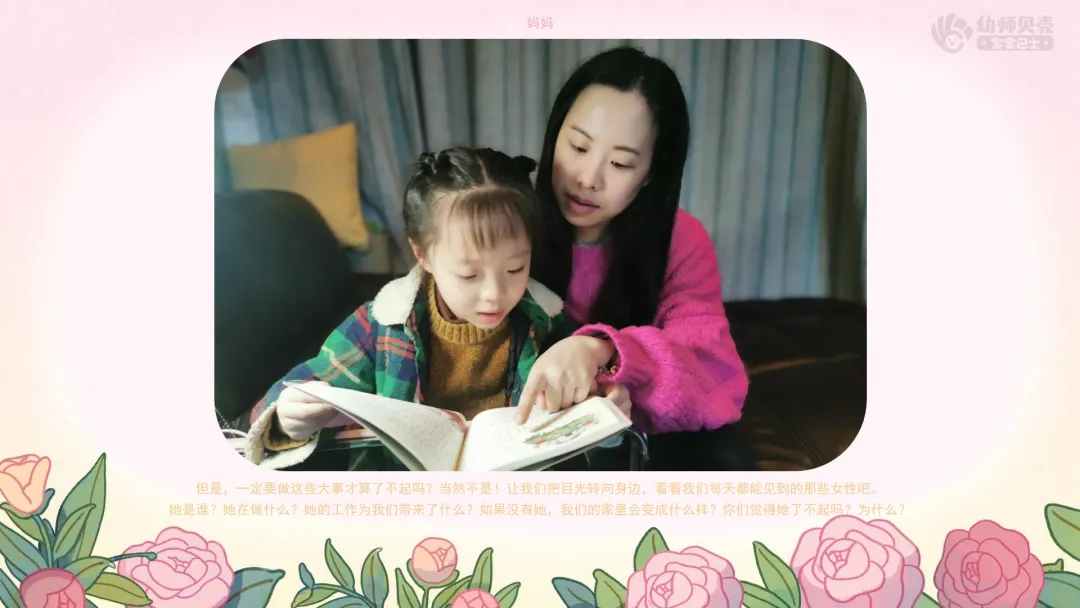 幼儿观察图片,讨论图片中女性所作出的贡献,感受她们在平凡小事中所体现出的了不起。