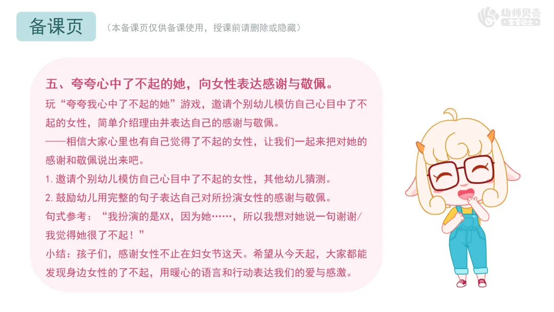 玩“夸夸我心中了不起的她”游戏,邀请个别幼儿模仿自己心目中了不起的女性,简单介绍理由并表达自己的感谢与敬佩。