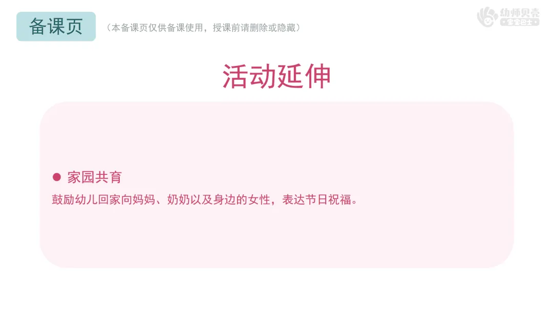 鼓励幼儿回家向妈妈、奶奶以及身边的女性,表达节日祝福。