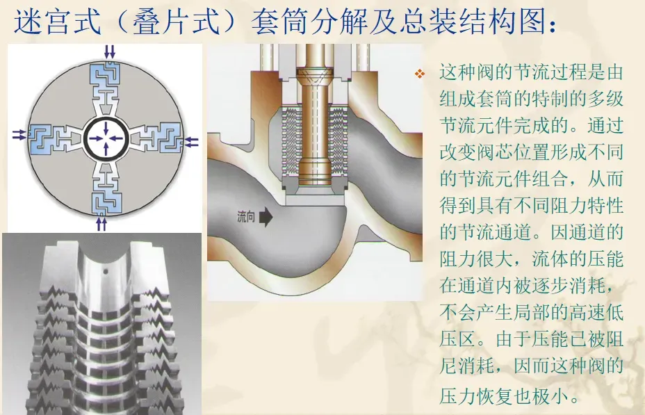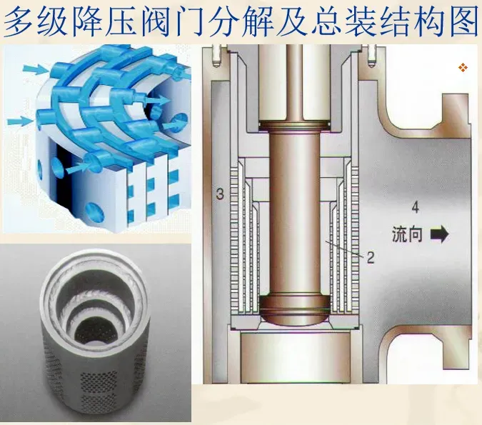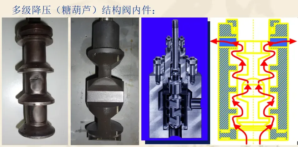 采用糖葫芦串结构 ,并在套筒中设有与之相应的多个节流口,这样就将原集中在一个节流口上的高压降,分散到多个节流口,相当于以多个低压降阀串联,来承受高压降。这种逐级降压的方式,使每一级都不超过临界压差。适用于高压差场合,防止流体产生汽蚀、空化、闪蒸、噪音等现象。由于阀内件结构及流路的复杂性,易出现流路堵死、阀芯卡死等现象,所以对介质的洁净程度有很高的要求。