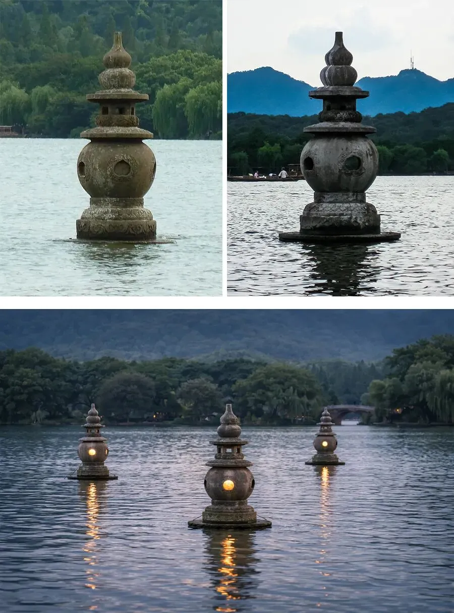 那么,“三潭印月”里的“潭”到底是什么呢?其实呀,它是三座静静立在湖中央的石塔。它们的样子像一个个小小的宝葫芦,身上还有精美的花纹和圆圆的小洞,看起来古朴又精致。最神奇的是,当湖水像镜子一样平静的时候,石塔的影子会清晰地倒映在水面上;当微风吹过,水面泛起一圈圈波纹,倒影也会跟着轻轻摇晃,变得闪闪发光、若隐若现,就像梦里的仙境一样美!