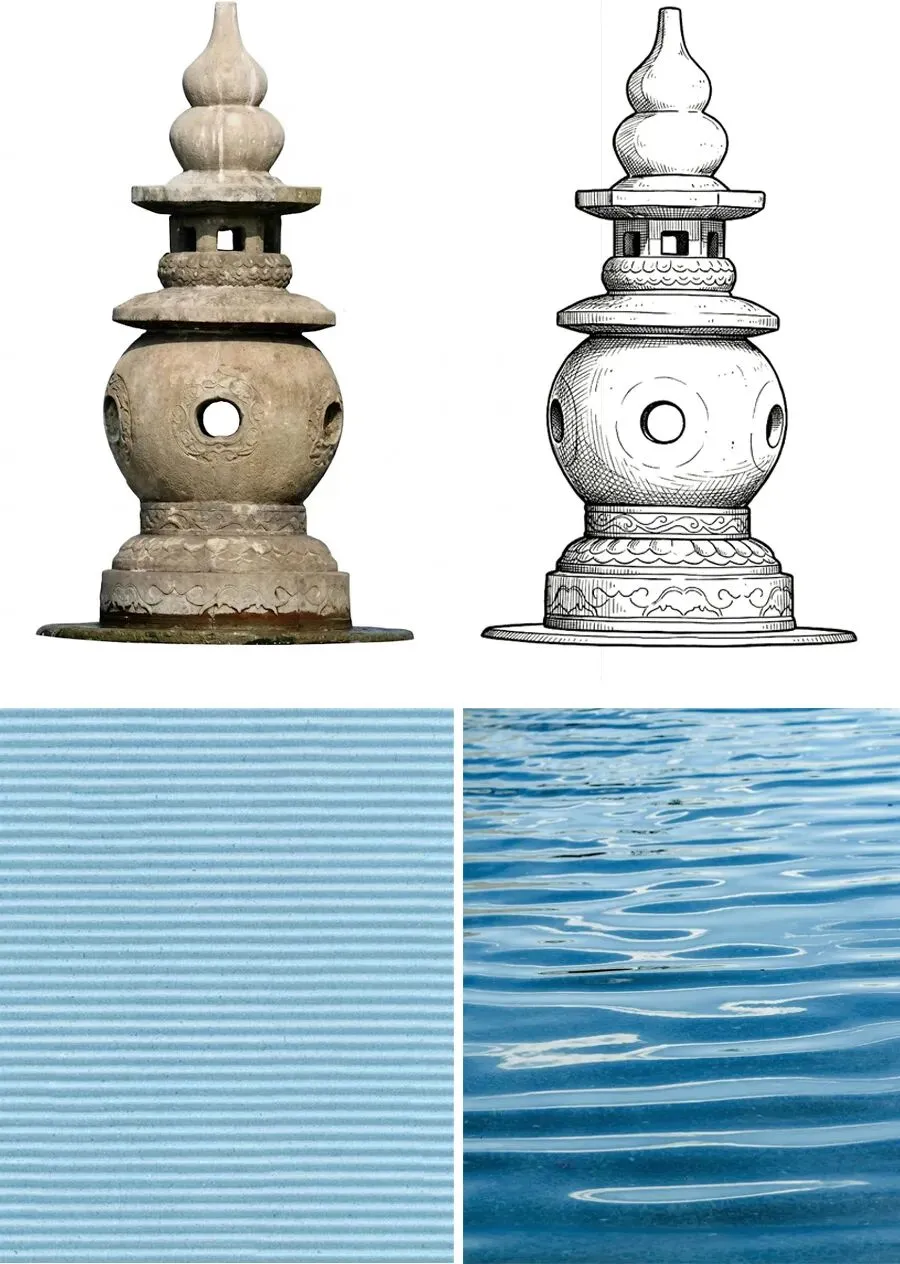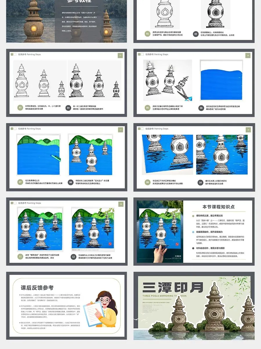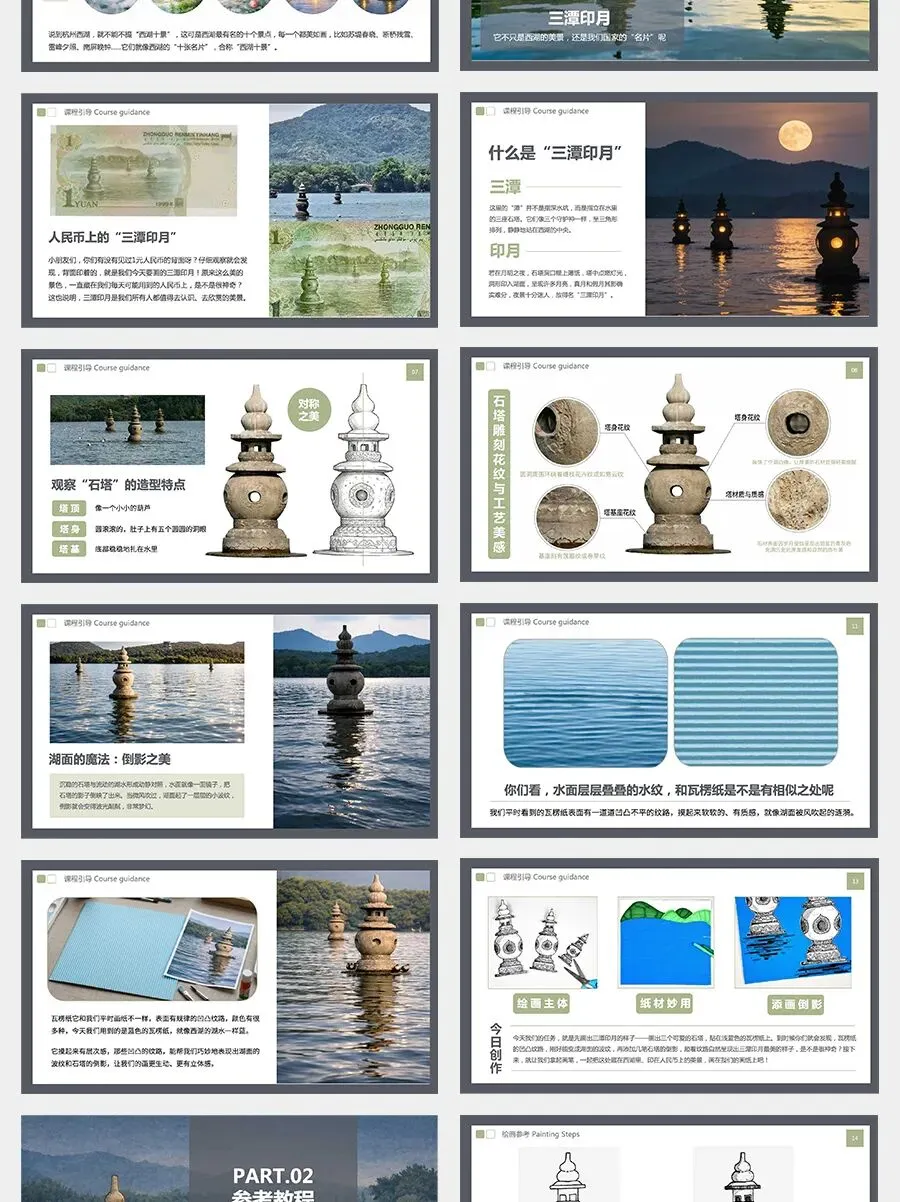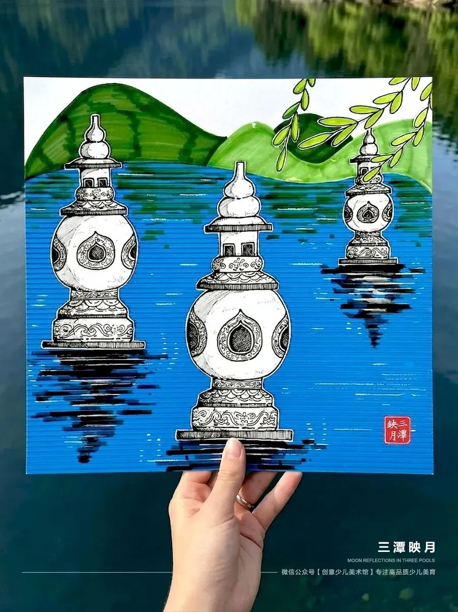 今天,我们要用一种非常有趣的材料来表现这种“水面和倒影”的效果——它就是瓦楞纸!它表面有起伏的纹路,就像湖面的波纹。我们把画好的石塔贴在上面,就能表现出水面和倒影的效果。准备好了吗?一起动手画出美丽的三潭印月吧!