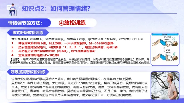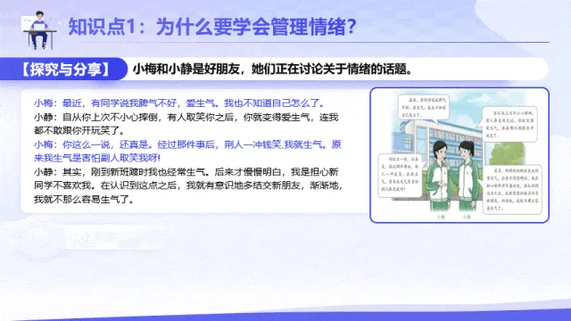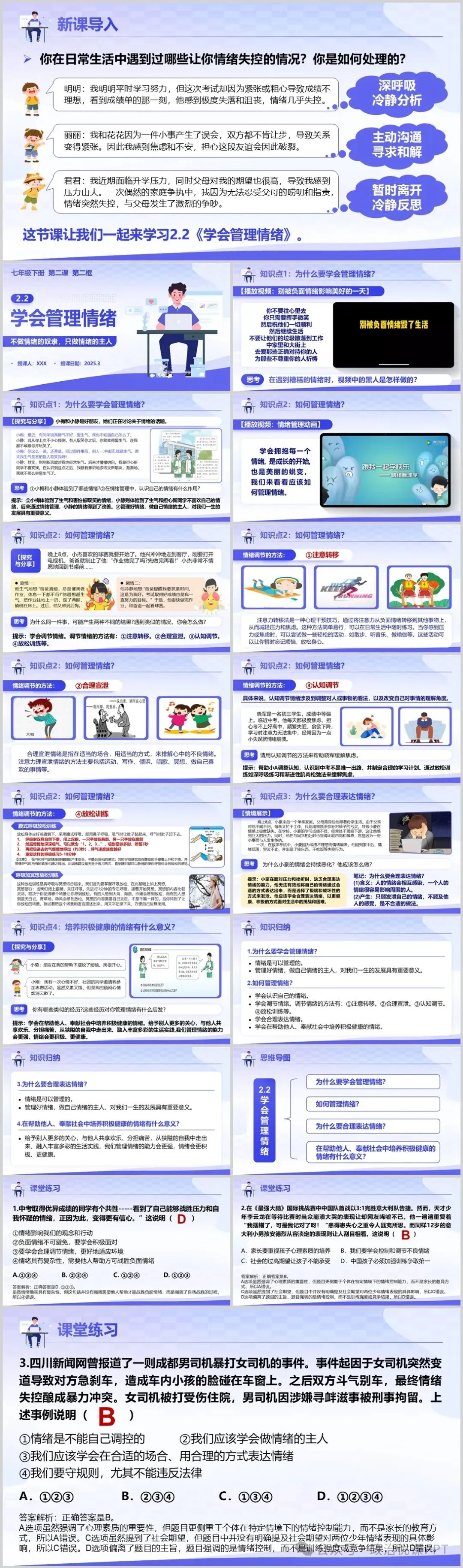 本期【会员群】更新课件2.2《学会管理情绪》,本次课件内容是2024秋统编版道德与法治七年级下册第一单元第二课第二框,共18页,建议教学时长为1课时。