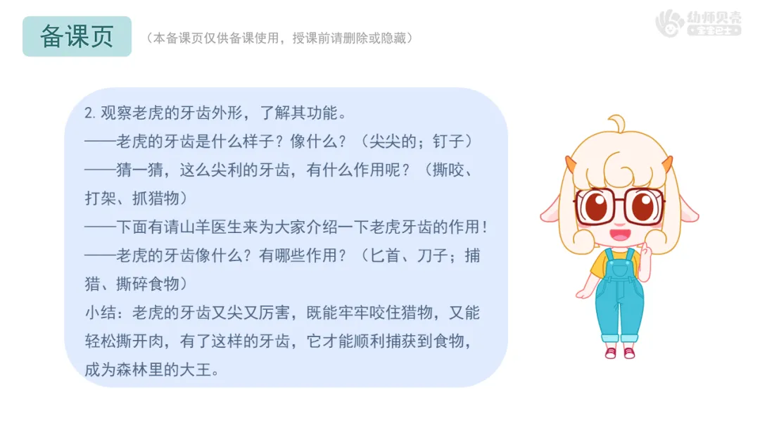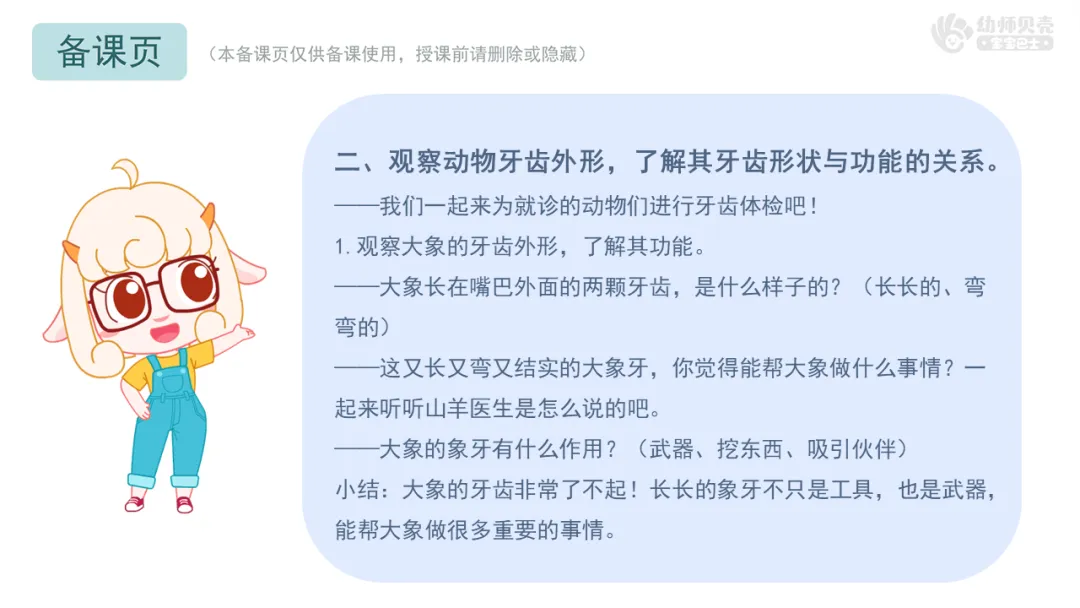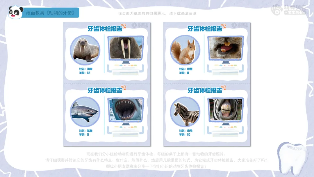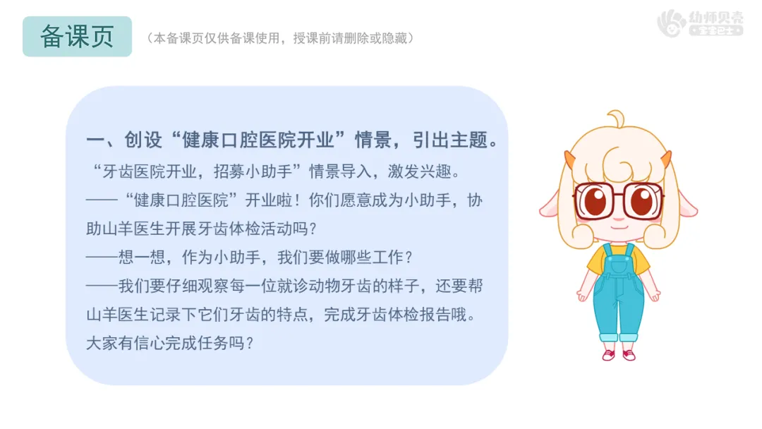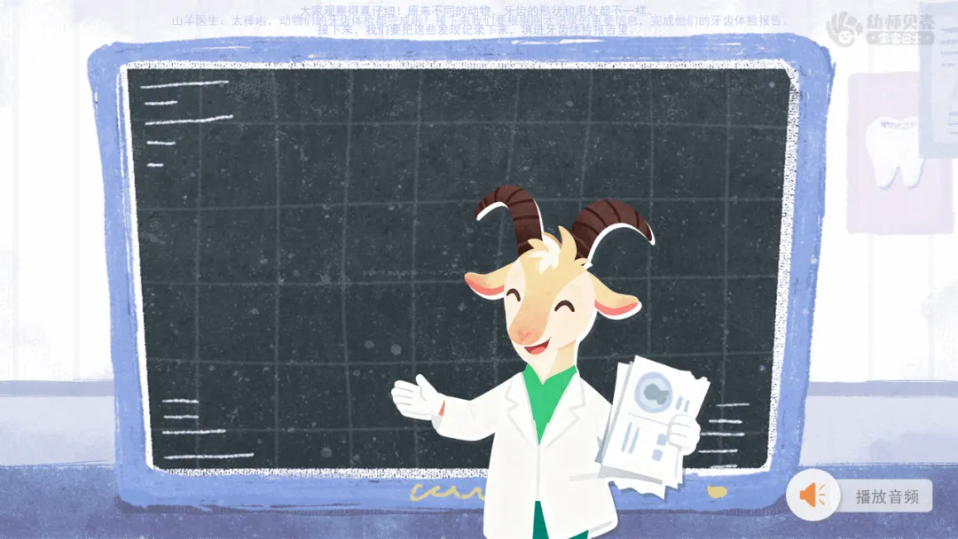 ——我们要仔细观察每一位就诊动物牙齿的样子,还要帮山羊医生记录下它们牙齿的特点,完成牙齿体检报告哦。大家有信心完成任务吗?