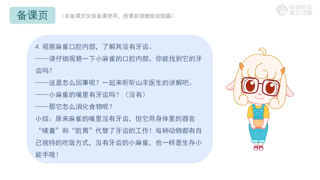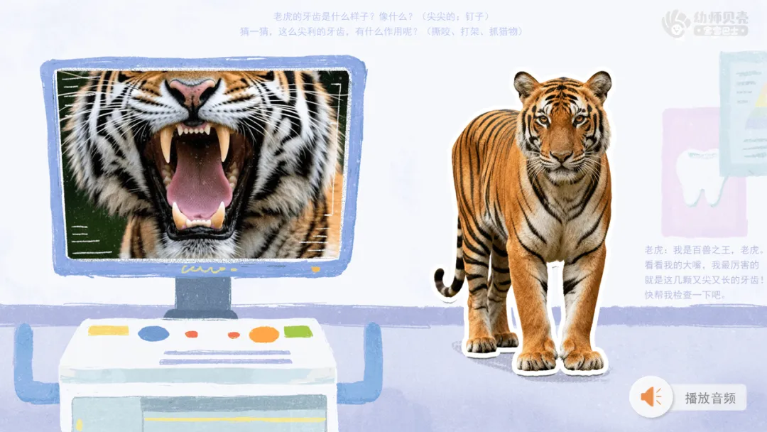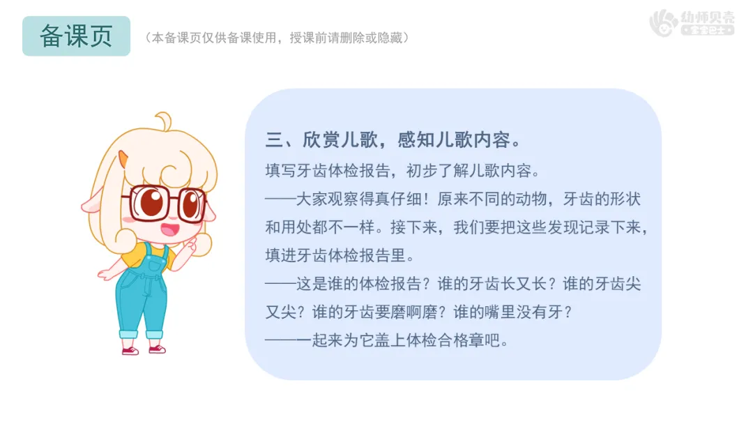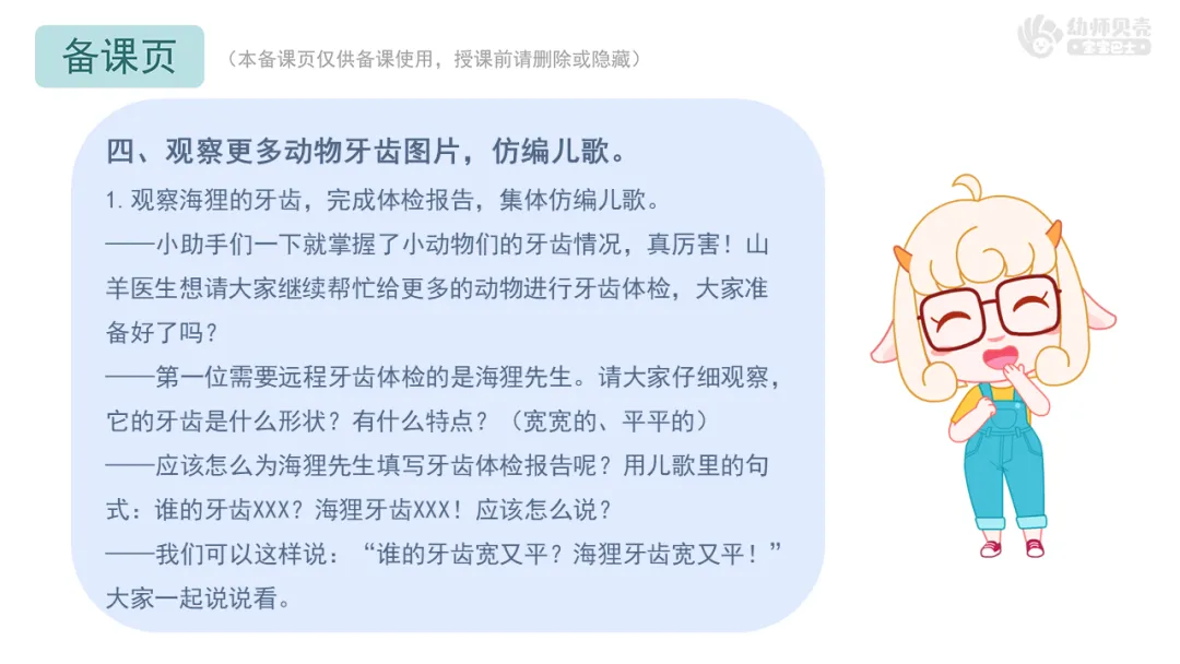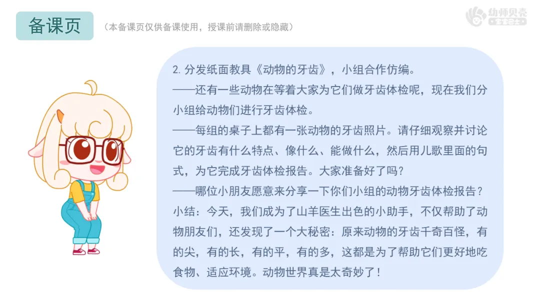 ——我们要仔细观察每一位就诊动物牙齿的样子,还要帮山羊医生记录下它们牙齿的特点,完成牙齿体检报告哦。大家有信心完成任务吗?