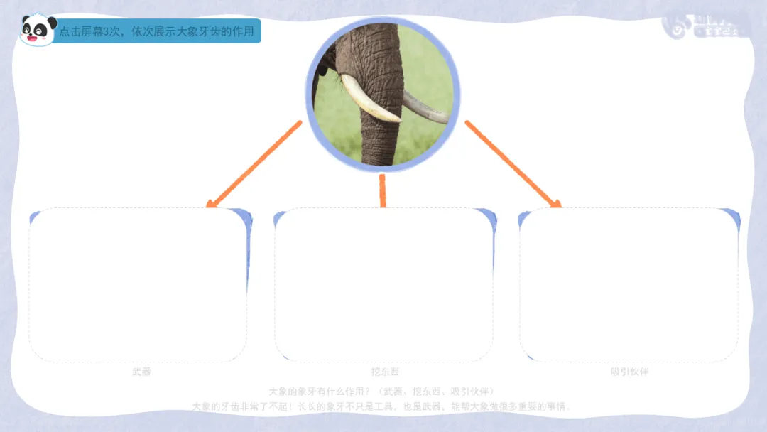 小结:大象的牙齿非常了不起!长长的象牙不只是工具,也是武器,能帮大象做很多重要的事情。