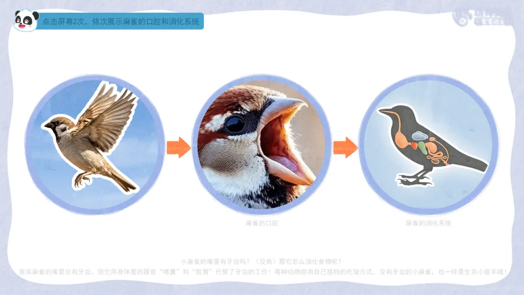 小结:原来麻雀的嘴里没有牙齿,但它用身体里的器官“嗉囊”和“肌胃”代替了牙齿的工作!每种动物都有自己独特的吃饭方式,没有牙齿的小麻雀,也一样是生存小能手哦!
