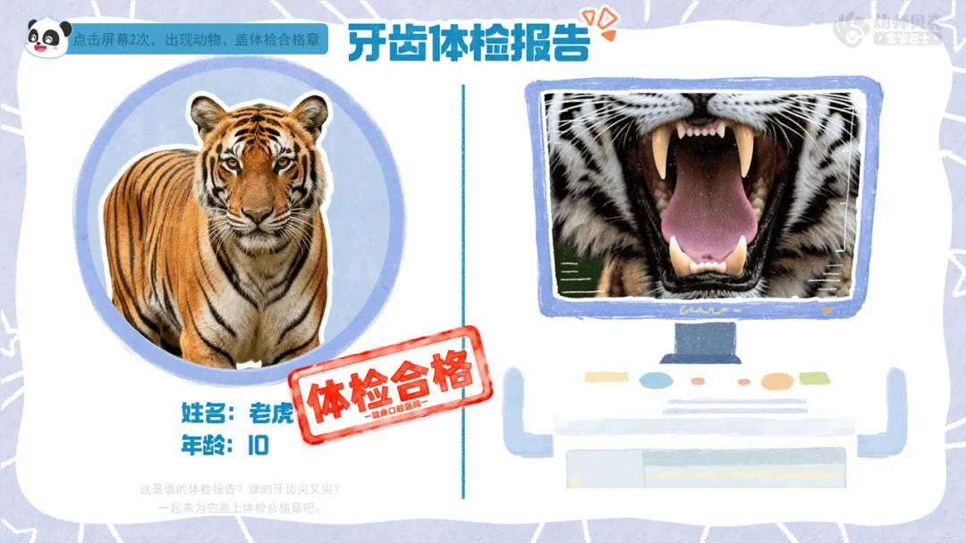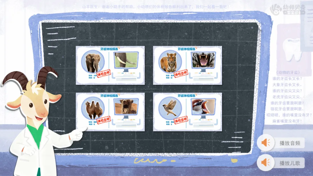 ——小助手们一下就掌握了小动物们的牙齿情况,真厉害!山羊医生想请大家继续帮忙给更多的动物进行牙齿体检,大家准备好了吗?