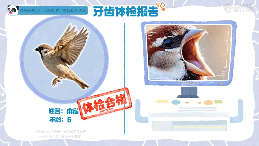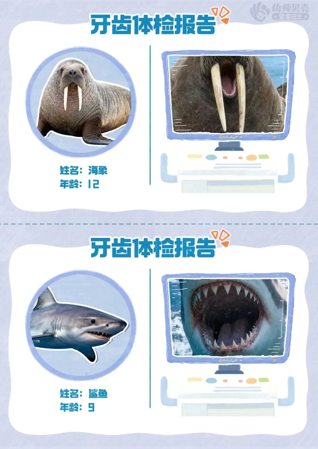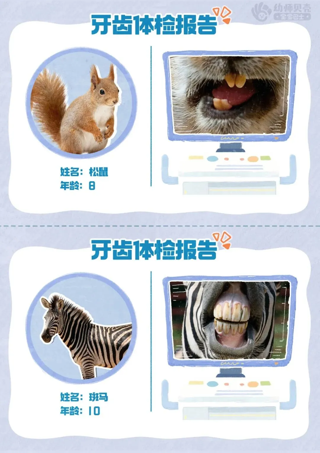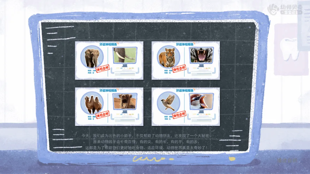 ——大家观察得真仔细!原来不同的动物,牙齿的形状和用处都不一样。接下来,我们要把这些发现记录下来,填进牙齿体检报告里。