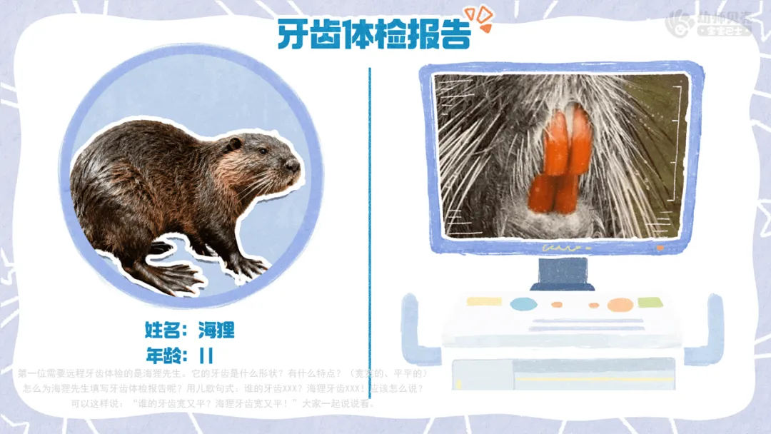 ——第一位需要远程牙齿体检的是海狸先生。请大家仔细观察,它的牙齿是什么形状?有什么特点?(宽宽的、平平的)
