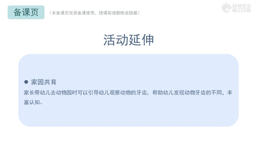 家长带幼儿去动物园时可以引导幼儿观察动物的牙齿,帮助幼儿发现动物牙齿的不同,丰富认知。