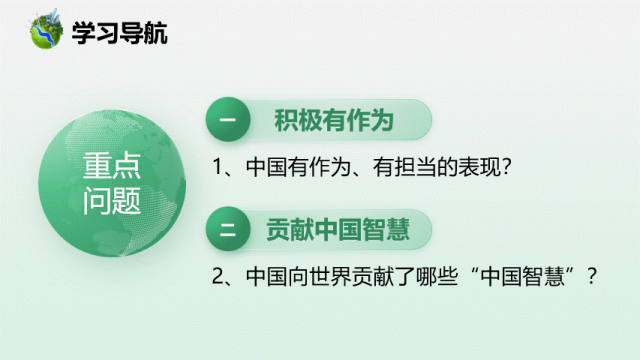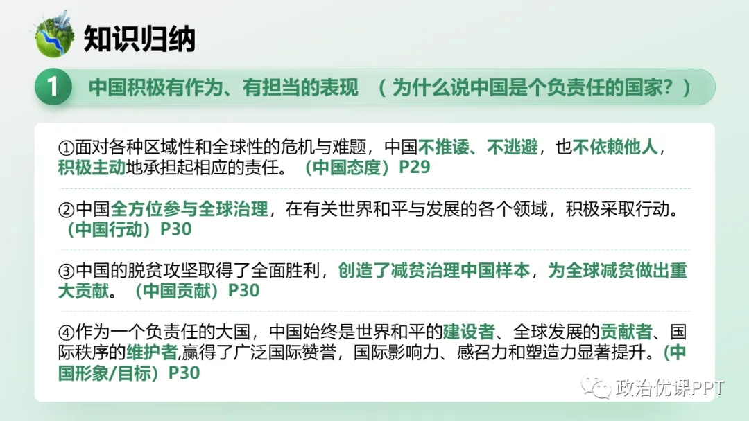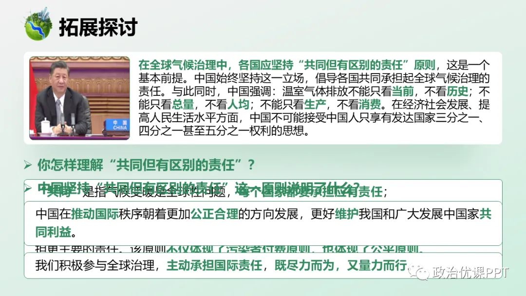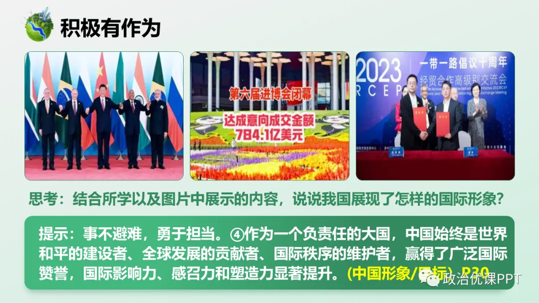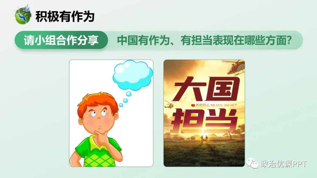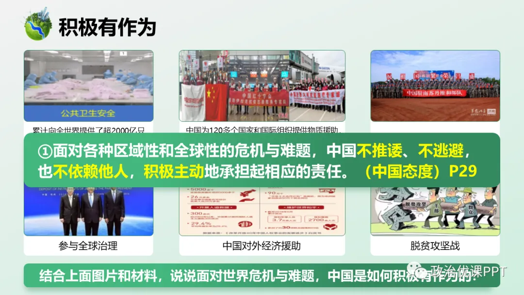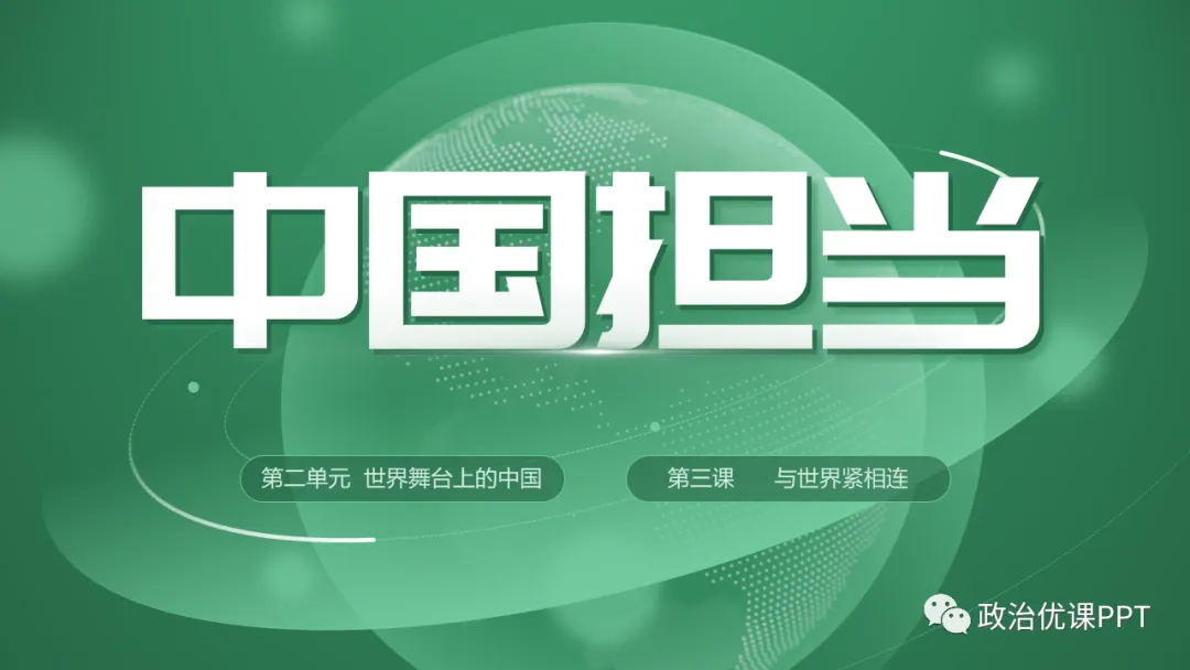 本期【会员群】更新课件3.1《中国担当》,本次课件内容是统编版道德与法治九年级下册第三课第一框,共22页,建议教学时长为1课时。
