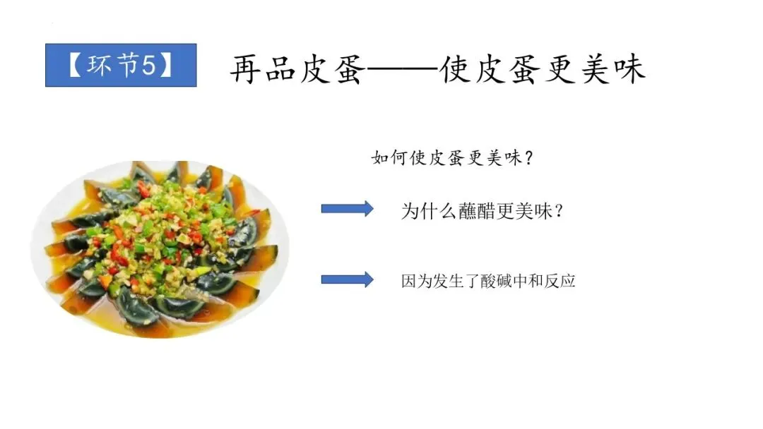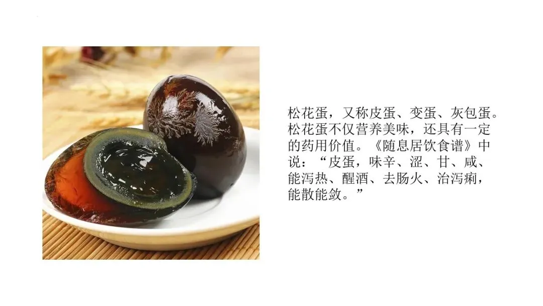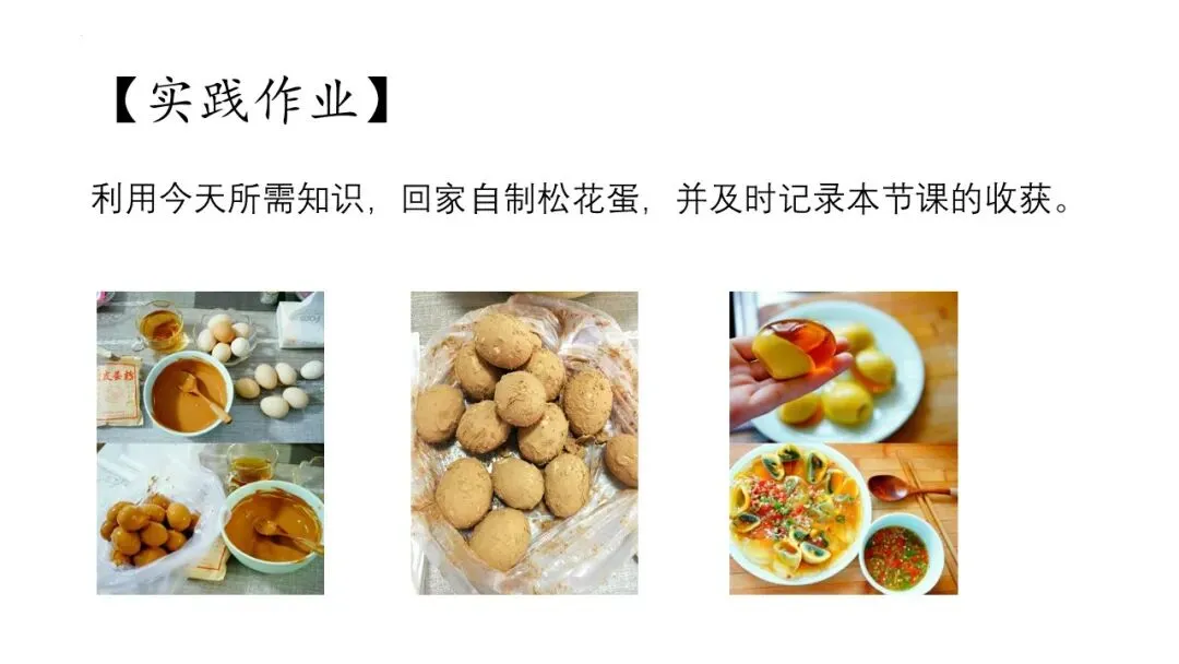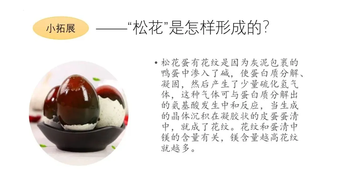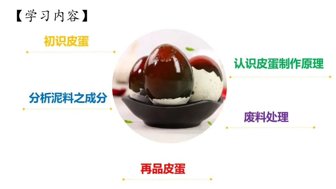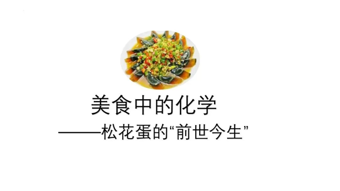 - 展示松花蛋图片,介绍松花蛋别称、历史与药用记载,引出课题《美食中的化学 —— 松花蛋的 “前世今生”》。