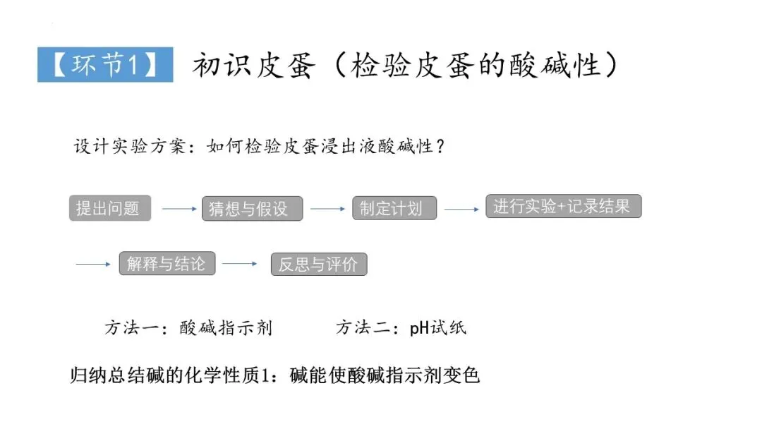 - 分组实验:取皮蛋浸出液,滴加石蕊 / 酚酞,或用 pH 试纸测定,记录现象。