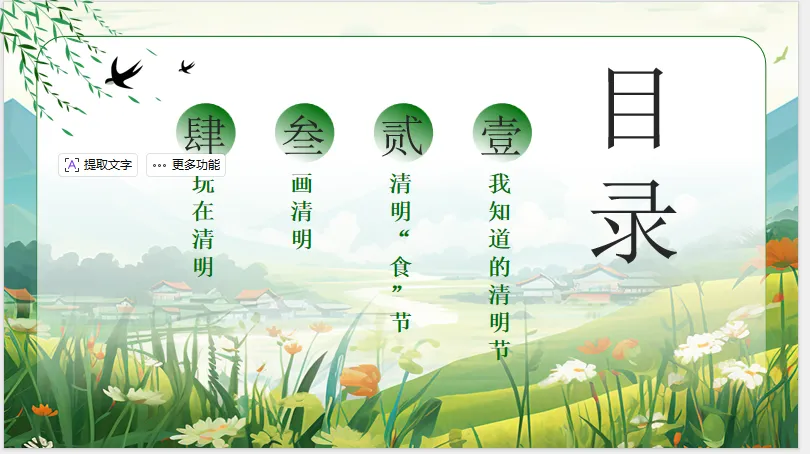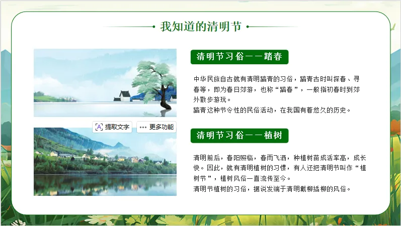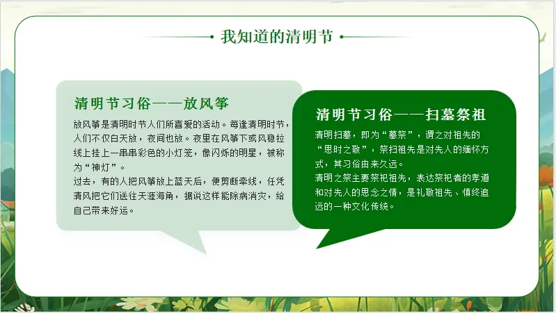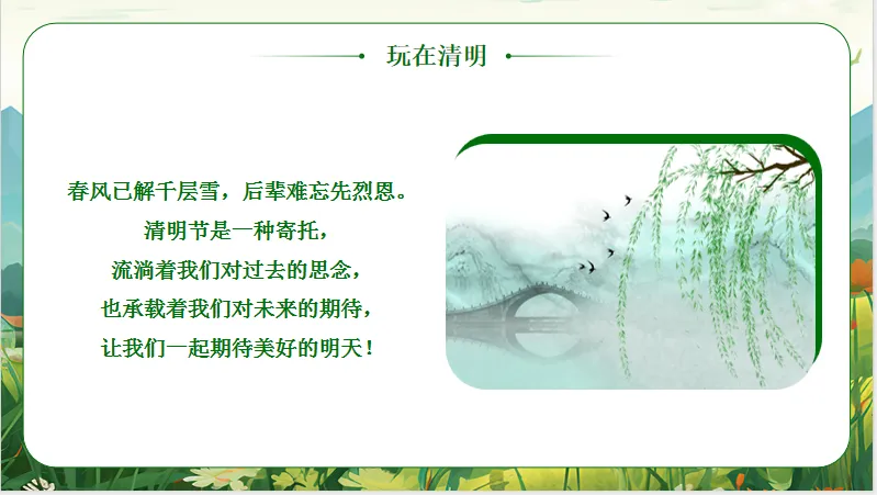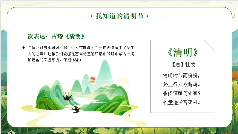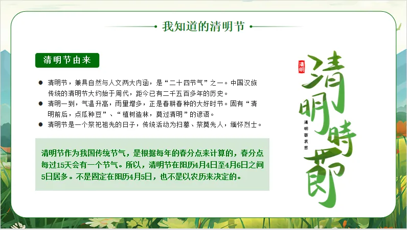 1、了解清明节的来历,知道清明节的日子及习俗,乐于参与清明节的活