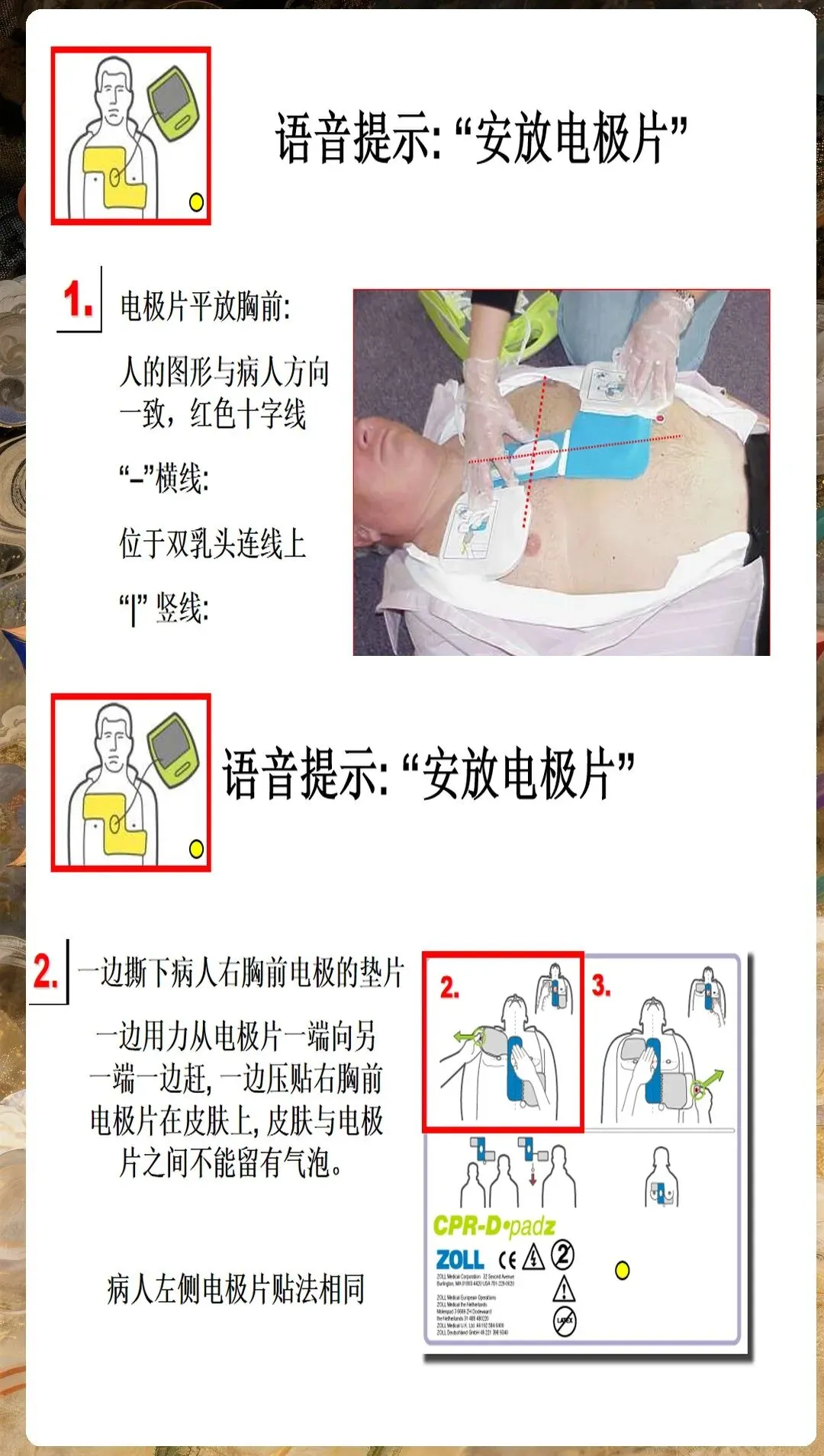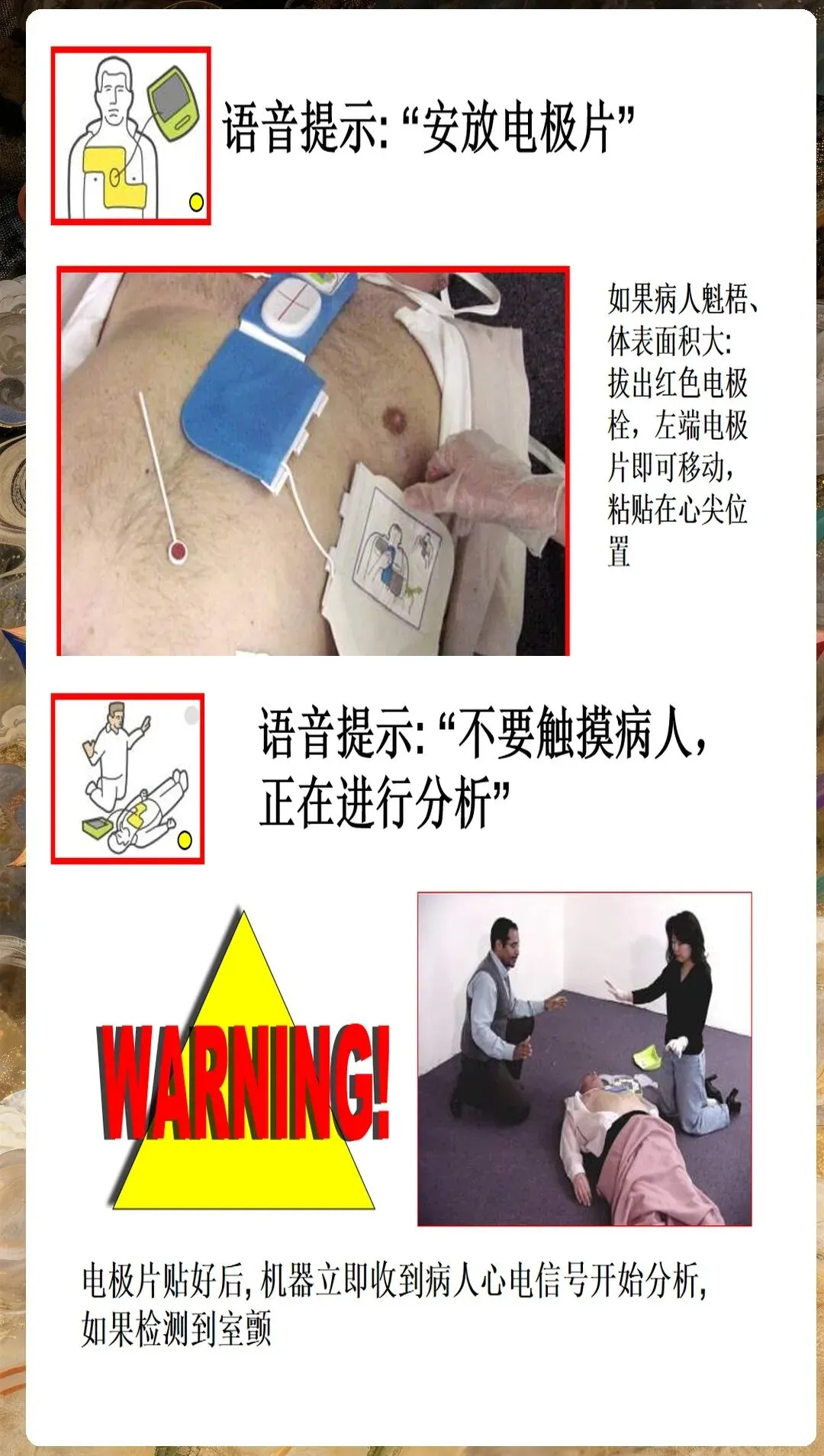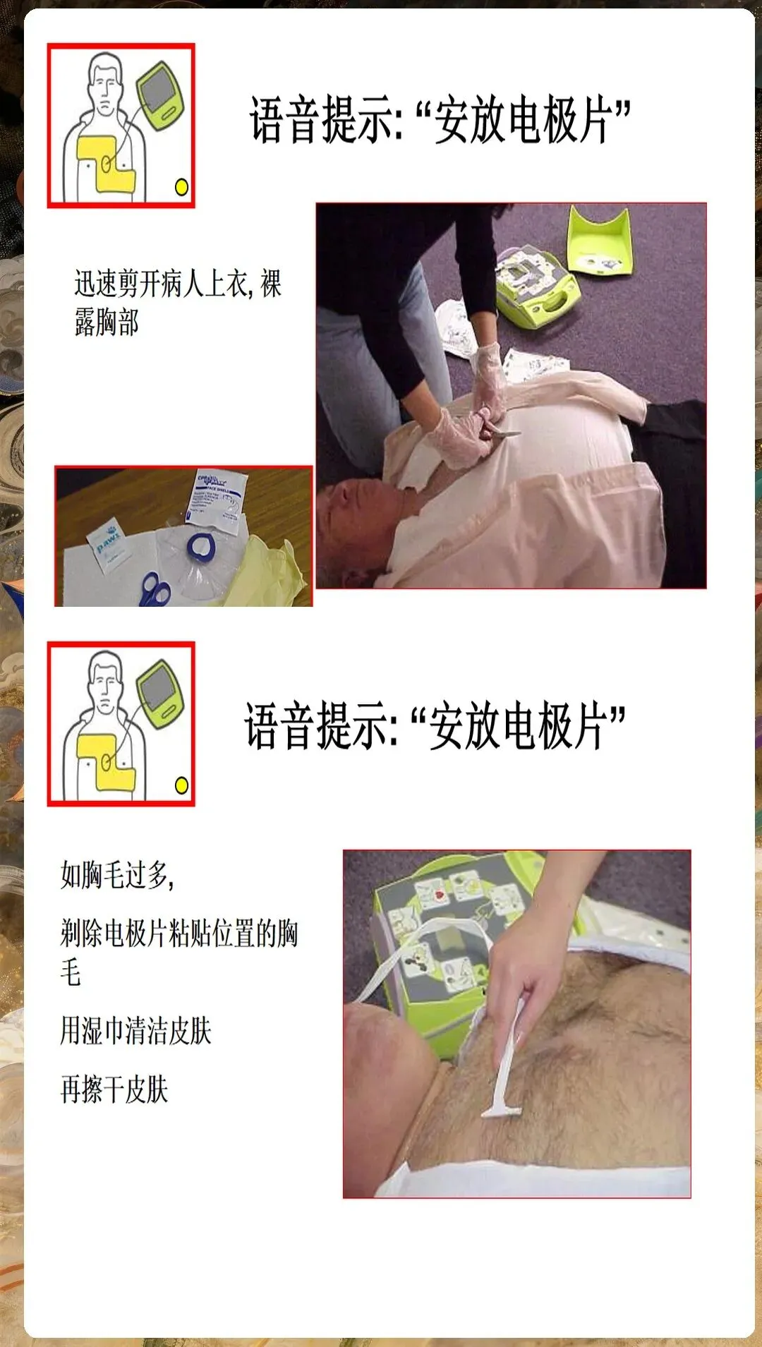 环境安全评估不容忽视。确保现场安全,无火灾、爆炸、触电等危险;评估患者是否处于潮湿环境,是则需转移至干燥处;检查患者身上是否有植入式心脏复律除颤器(ICD),距离贴片至少8厘米。