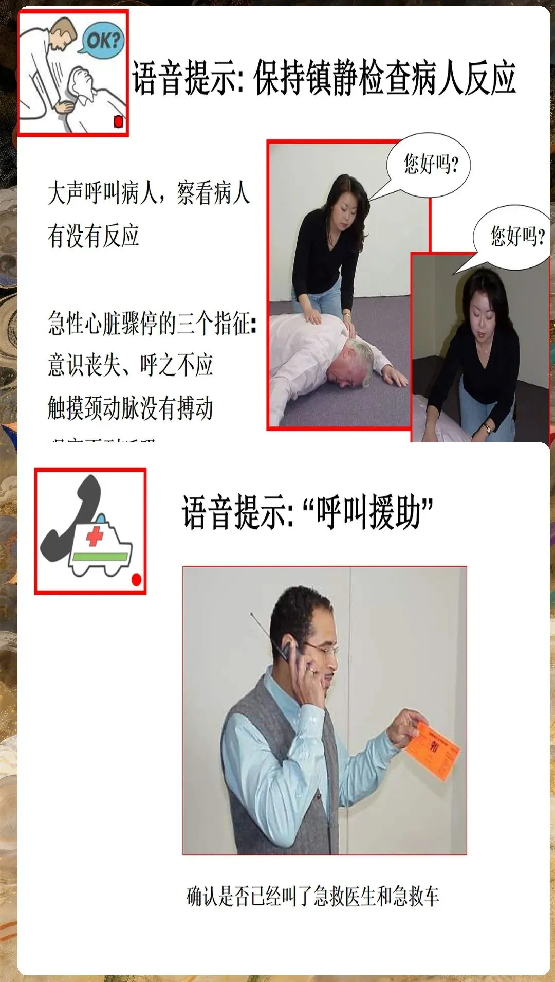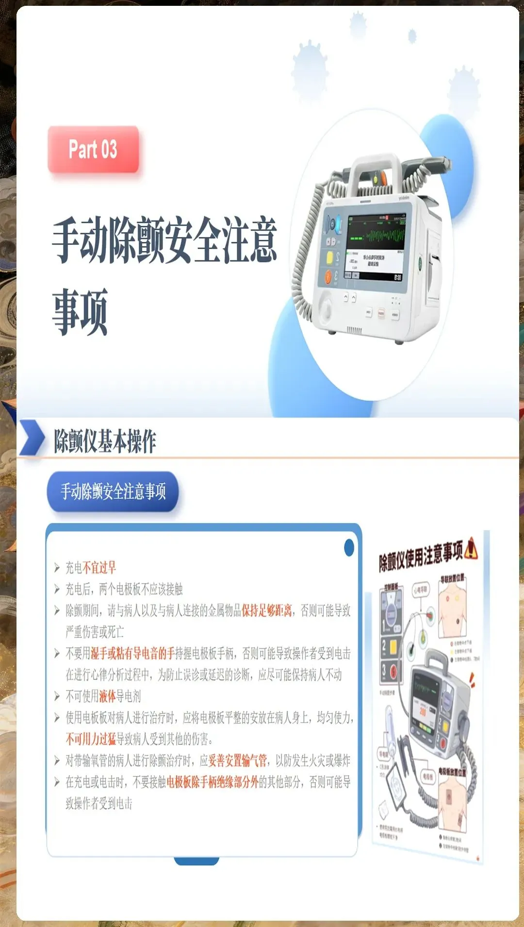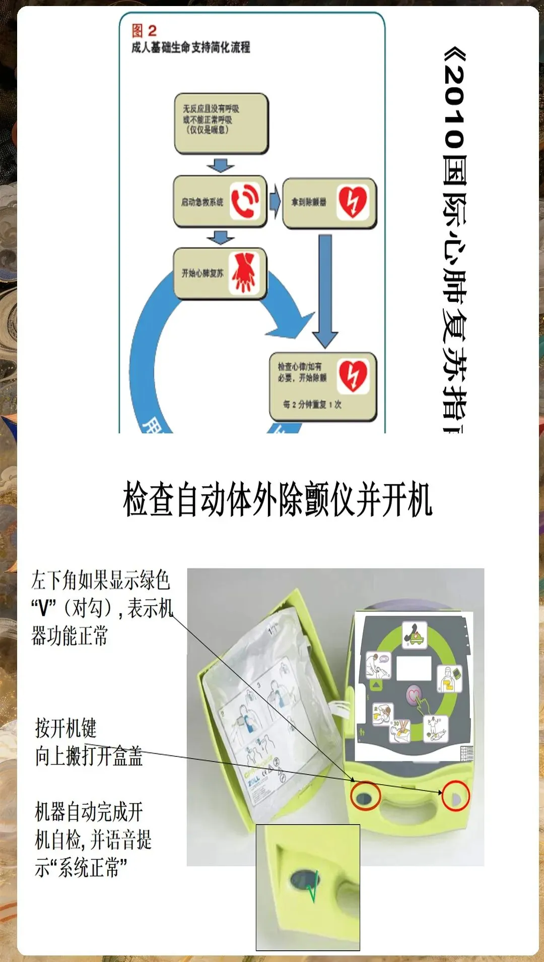 环境安全评估不容忽视。确保现场安全,无火灾、爆炸、触电等危险;评估患者是否处于潮湿环境,是则需转移至干燥处;检查患者身上是否有植入式心脏复律除颤器(ICD),距离贴片至少8厘米。