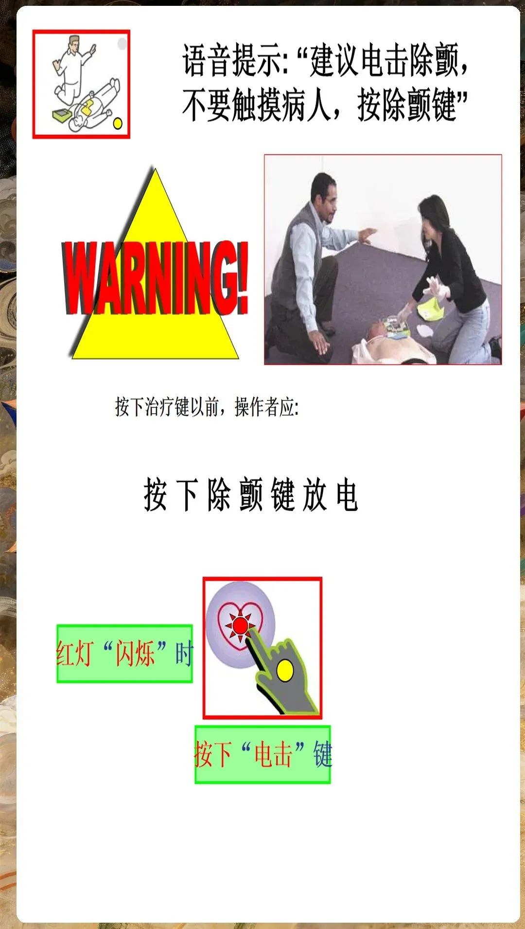 严格遵循"开机-贴片-分析-除颤-按压"标准化流程。按下AED开机键,设备自动启动并提示操作步骤,无需专业知识即可按照语音提示操作。