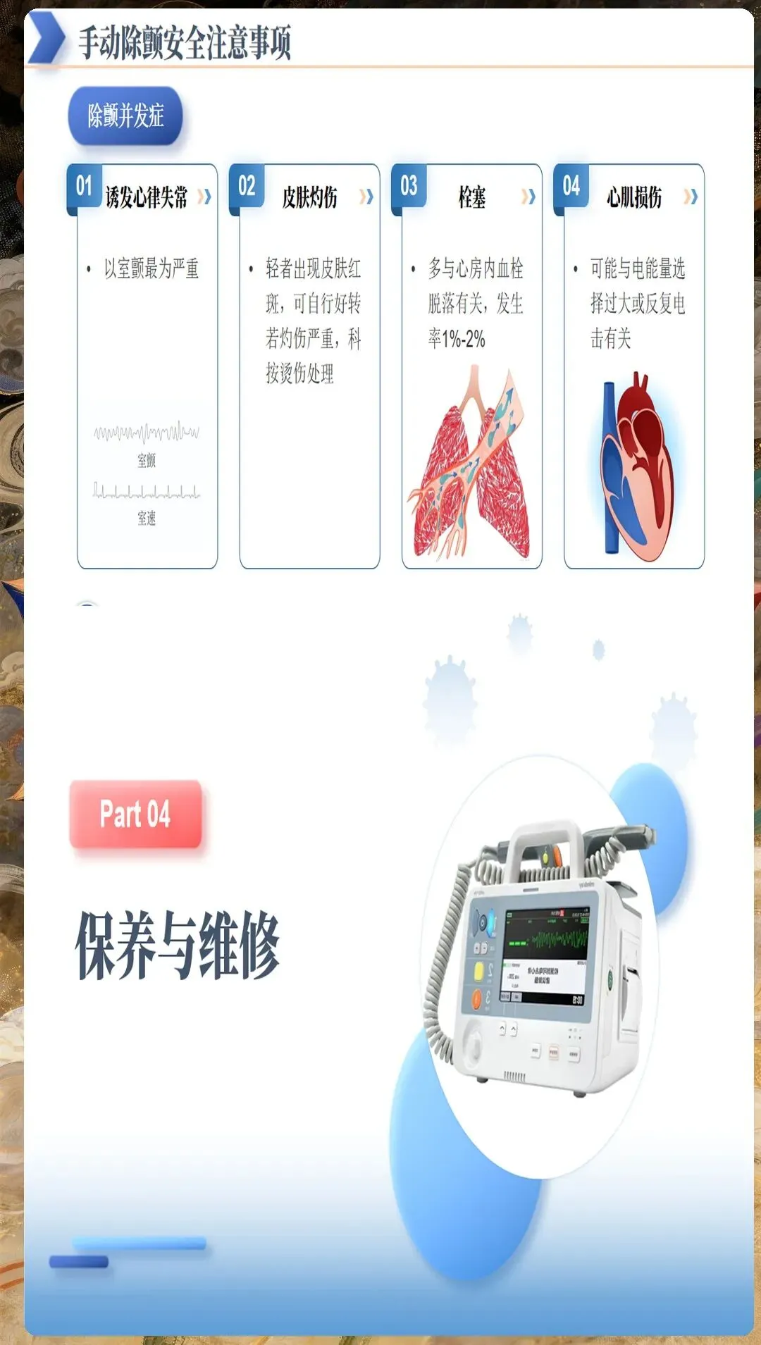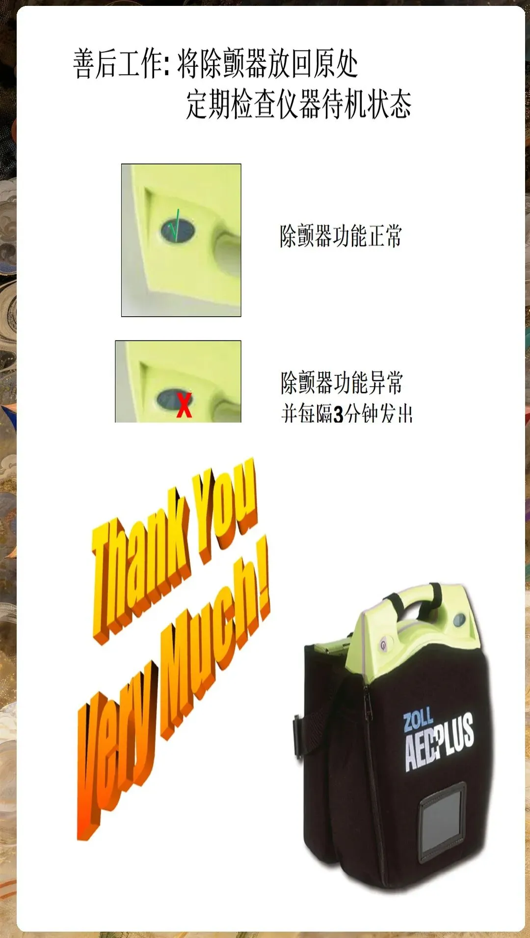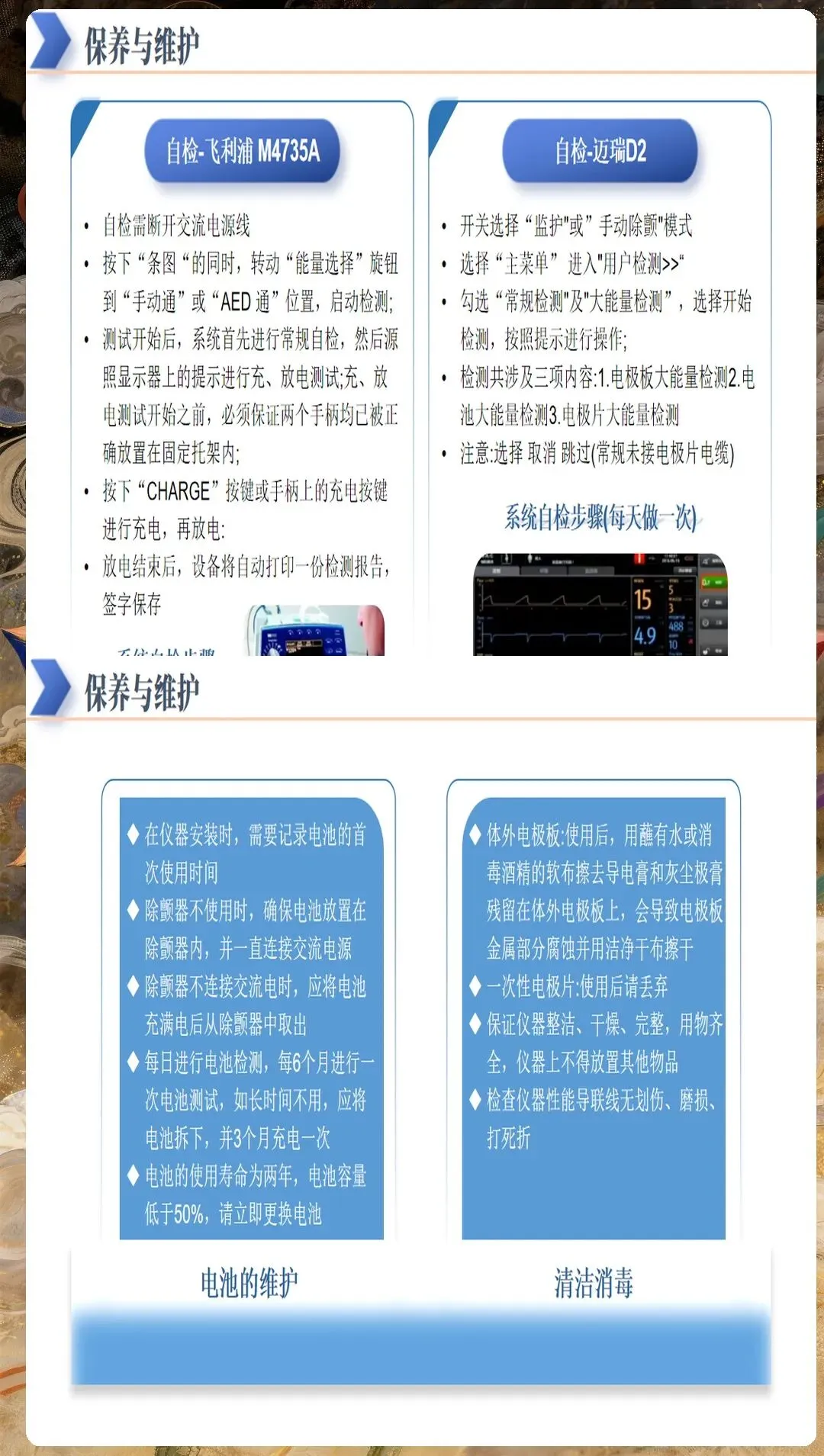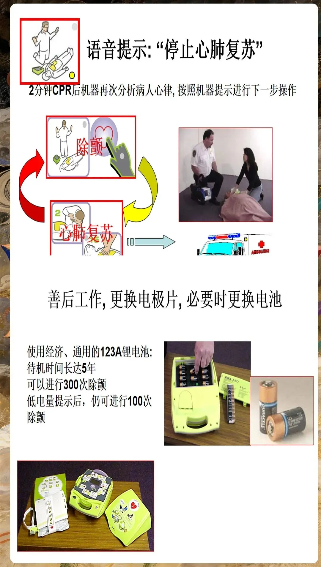 设备维护与管理包括:除颤后关闭AED电源,检查设备状态;清洁电极片和导线,放回原位;更换电池和电极片,确保下次使用正常;记录操作过程和患者信息,上报急救中心。
