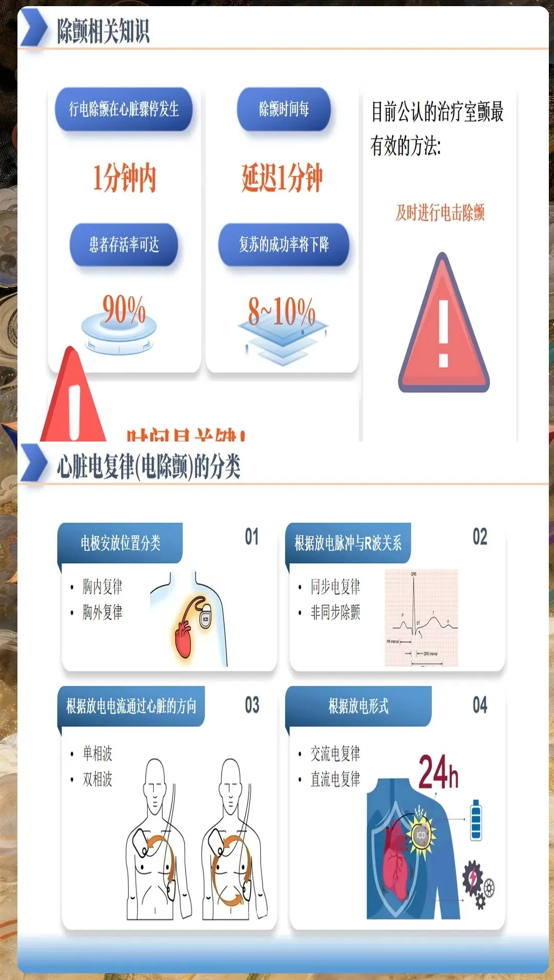 植入式心脏复律除颤器(ICD)患者需在除颤电极与ICD植入位置之间保持至少8厘米距离,避免干扰ICD工作;ICD放电前患者可能出现肌肉收缩,AED可正常使用。