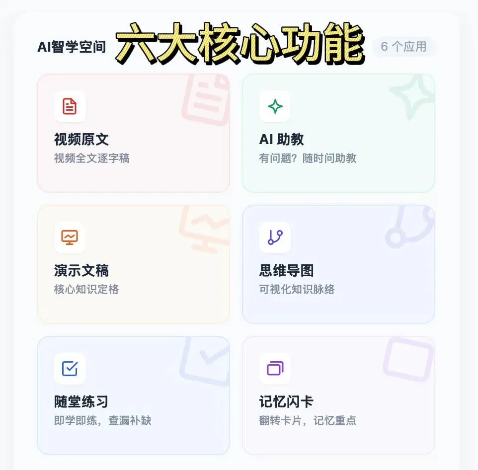 基于视频内容自动提炼核心知识点,拆解知识层级、梳理逻辑关联,生成可视化思维导图。重点内容用彩色标签区分,难点、考点一目了然,帮你快速搭建知识框架,告别 “看完视频没头绪、复习无从下手” 的尴尬,无论是备考复盘还是课程预习都能高效上手。
