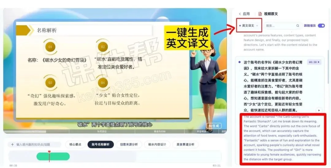打破传统视频 “只能看、没法读” 的局限,AI自动生成完整逐字稿并与视频实时同步。观看文稿高亮跟随,重点内容一眼锁定,点击即可跳转知识切片,同时可以生成英文译文,双向对照。