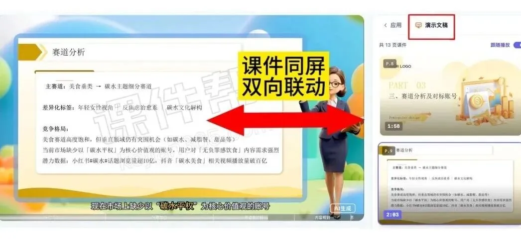 AI 自动抓取视频中PPT 画面,实现课件与视频进度无缝同步。点击右侧ppt的截图,左侧视频会精准跳转至对应讲解片段;滑动视频进度条,课件也会自动翻页,完美解决 “视频翻页太快看不清、课件找不到对应讲解” 的困扰,视觉与听觉双重同步,学习逻辑更清晰。