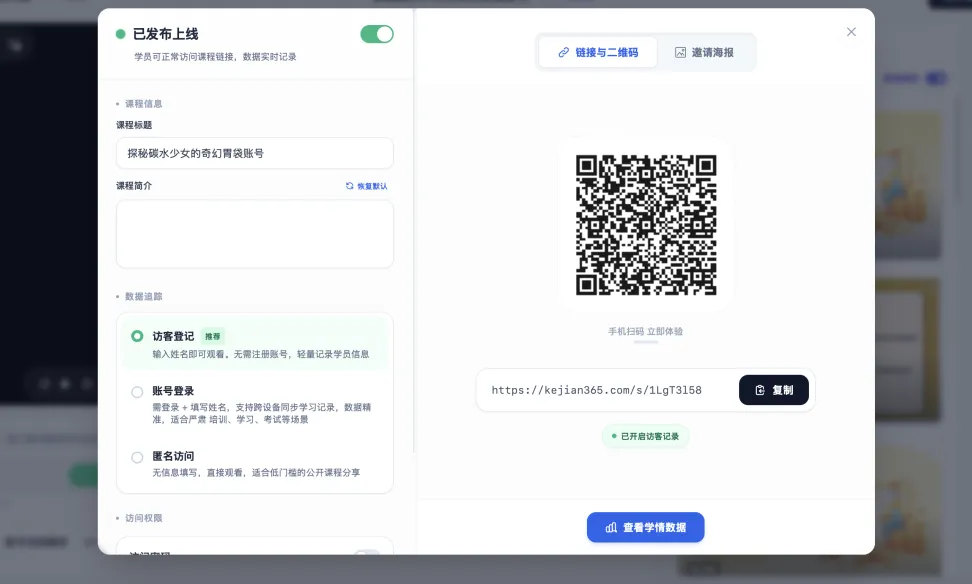 不仅如此,用课件帮做好的AI互动课,学生可以通过链接或二维码直接访问,系统会实时记录学习数据,可以进入后台查看学生的访问、学习进度等超详细的学情数据,了解哪个部分学起来最困难,哪个部分学生最感兴趣。